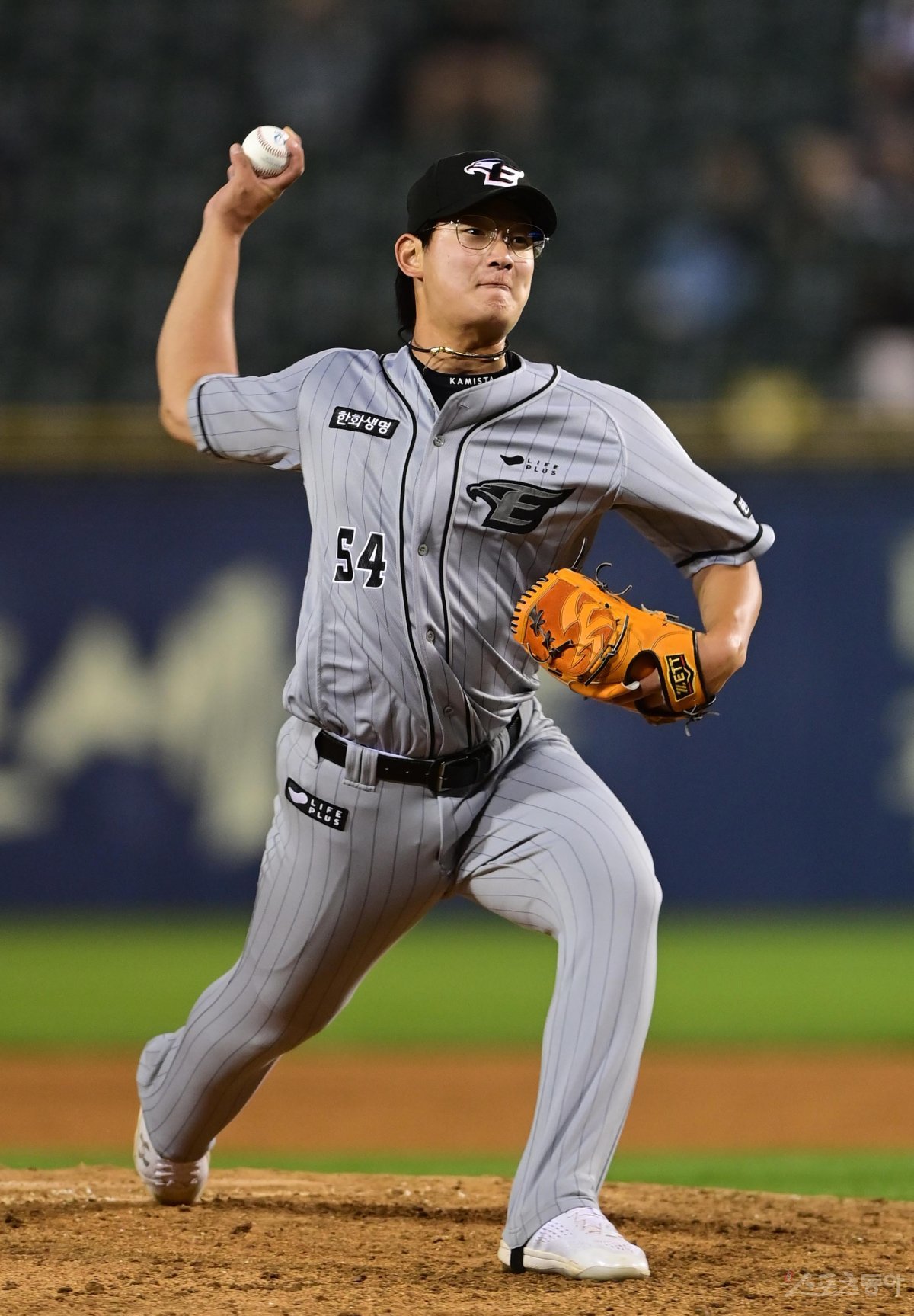7일 서울 잠실야구장에서 열린 ‘2023 신한은행 SOL KBO리그’ 두산 베어스와 한화 이글스의 경기에서 7회초 한화 김서현이 교체로 마운드에 올라 역투하고 있다.