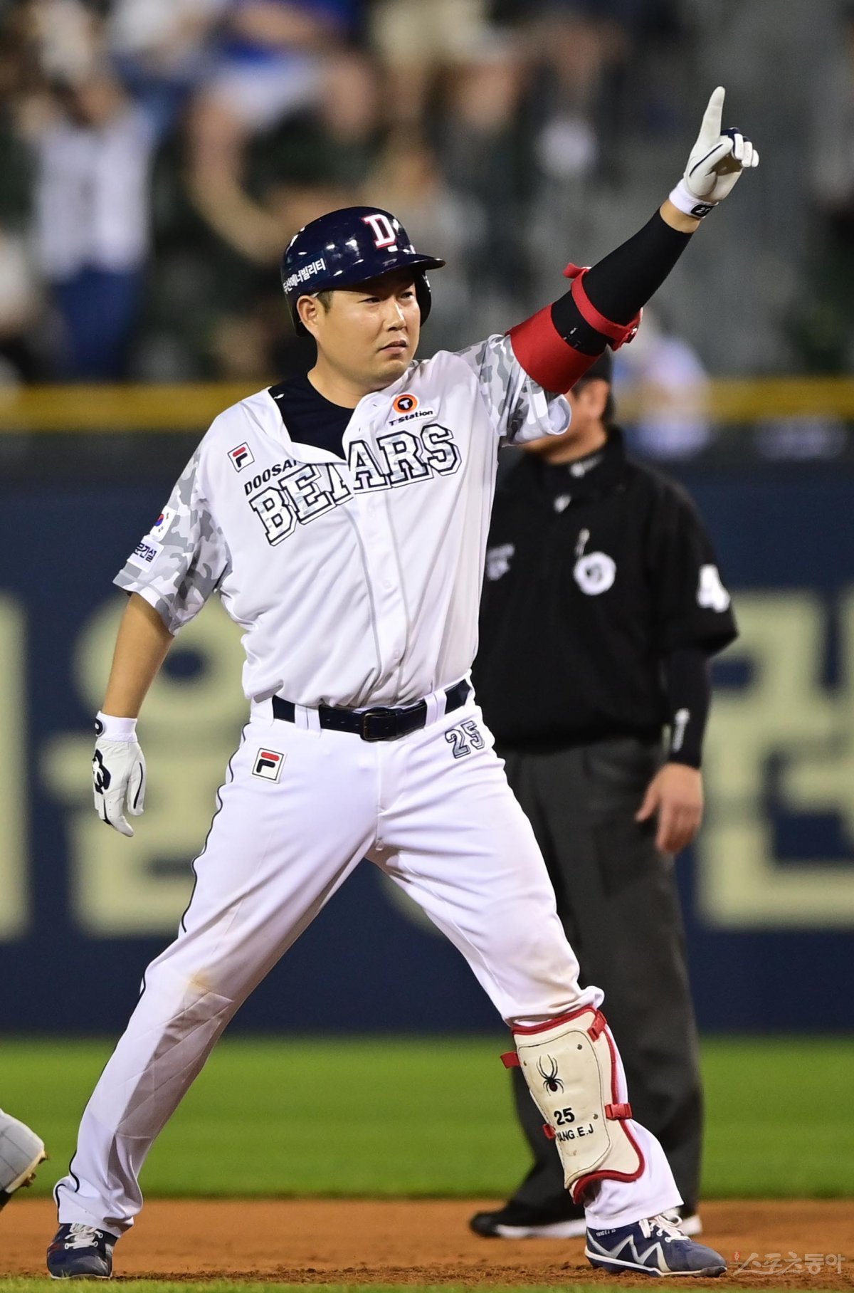 7일 서울 잠실야구장에서 열린 ‘2023 신한은행 SOL KBO리그’ 두산 베어스와 한화 이글스의 경기에서 7회말 2사 만루 두산 양의지가 2타점 좌전 동점 적시타를 친 후 세리머니를 하고 있다.