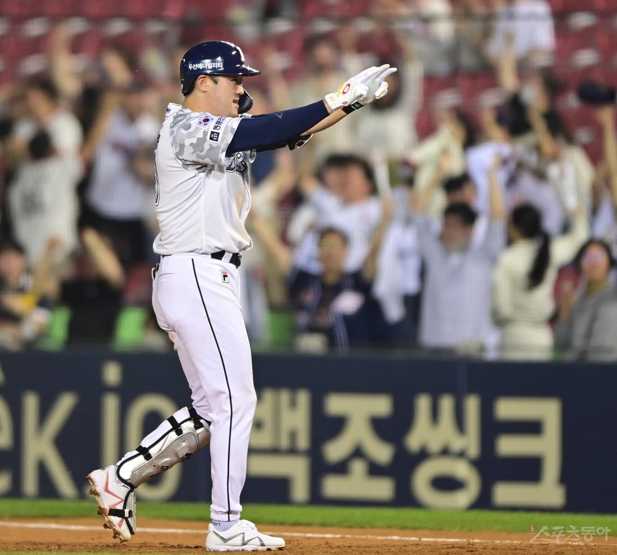 7일 서울 잠실야구장에서 열린 ‘2023 신한은행 SOL KBO리그’ 두산 베어스와 한화 이글스의 경기에서 7회말 2사 2, 3루 두산 양석환이 2타점 우전 적시타를 친 후 세리머니를 하고 있다.