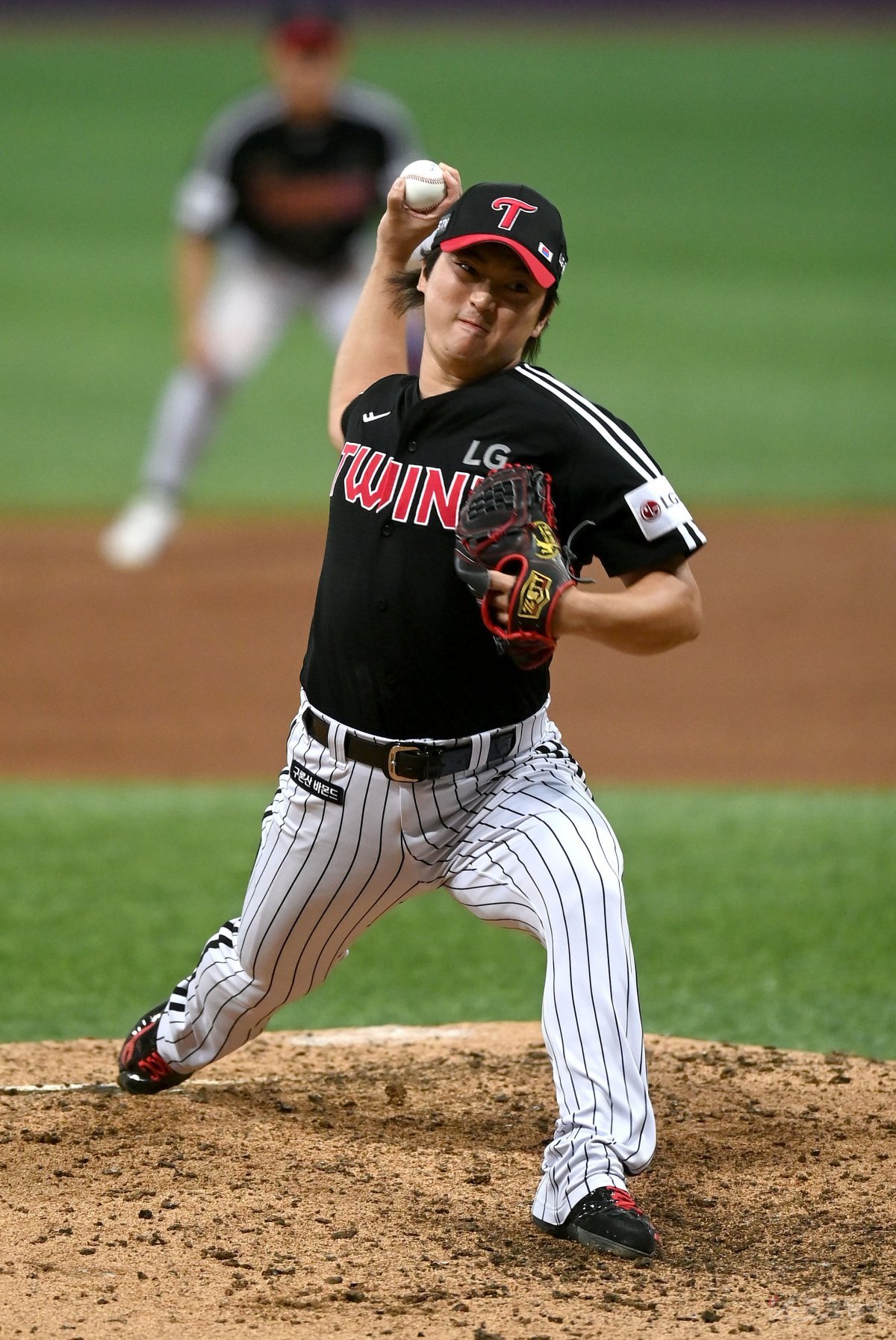 7일 서울 고척스카이돔에서 ‘2023 신한은행 SOL KBO리그’ LG 트윈스와 키움 히어로즈 경기가 열렸다. 9회말 등판한 LG 고우석이 역투하고 있다.