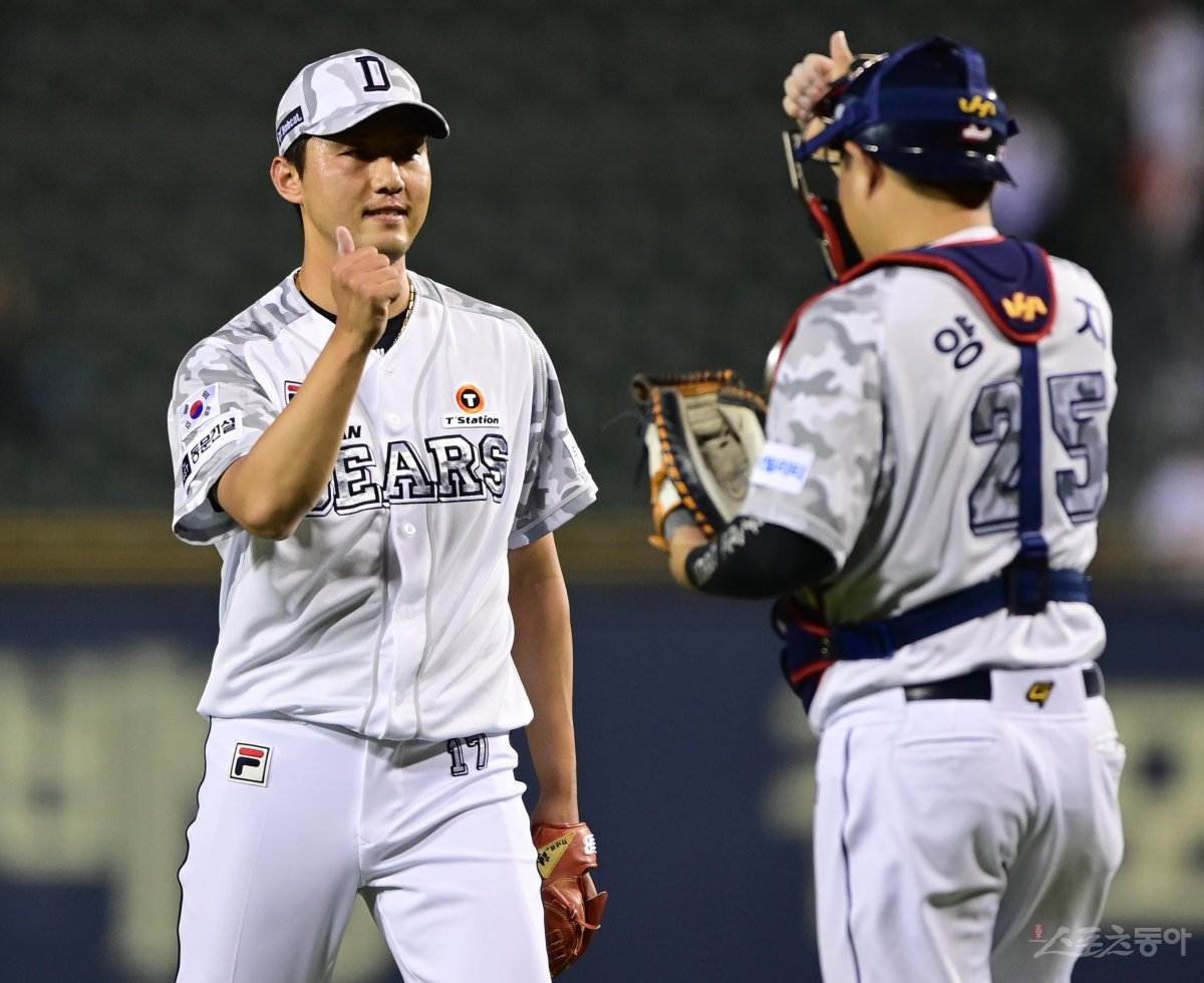 7일 서울 잠실야구장에서 열린 ‘2023 신한은행 SOL KBO리그’ 두산 베어스와 한화 이글스의 경기에서 6-3으로 승리한 두산 홍건희가 포수와 기쁨을 나누고 있다.