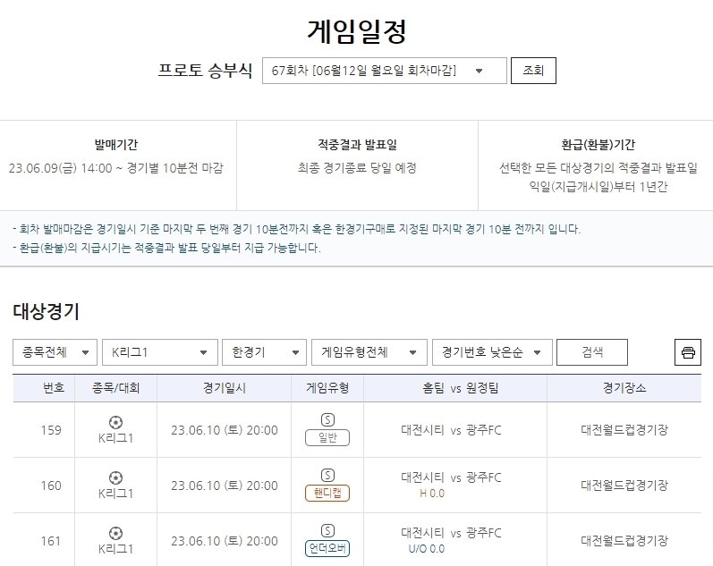 이번 프로토 승부식 67회차 중 대전시티즌(홈)-광주FC(원정)전을 대상으로 한 ‘한경기구매’ 게임에는 9일(금) 오후 2시부터 참여가 가능하며, ▲159번(일반) ▲160번(핸디캡) ▲161번(언더오버)의 각기 다른 3가지 방식으로 게임을 즐길 수 있다.