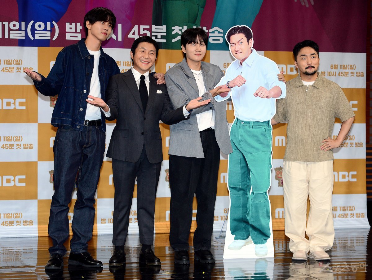 8일 서울 마포구 상암 MBC 골든마우스홀에서 열린 MBC 신규 예능 ‘안하던 짓을 하고 그래’ 제작발표회에 참석한 주우재, 조세호, 이용진, 유병재가 카메라를 향해 포즈를 취하고 있다.