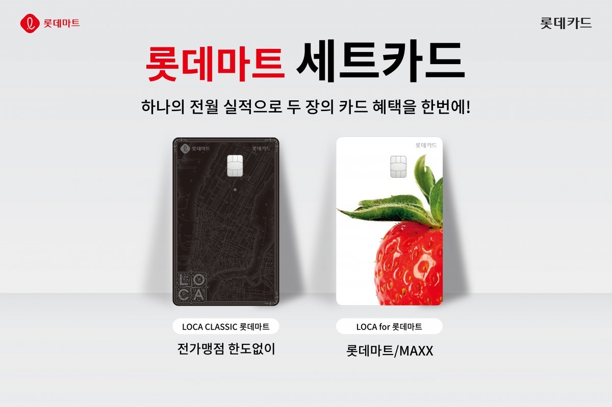 ‘로카 클래식 롯데마트’와 ‘로카 포 롯데마트’로 구성했다. 세트카드는 두 장의 카드를 세트로 구성해 혜택과 실적을 하나의 상품처럼 연결시킨 게 특징이다. 두 카드의 전월 실적을 합산하기에 한 카드의 실적만 달성해도 두 장의 카드 혜택을 모두 누릴 수 있다. 여기에 할인받은 실적도 전월 실적에 포함해 준다.