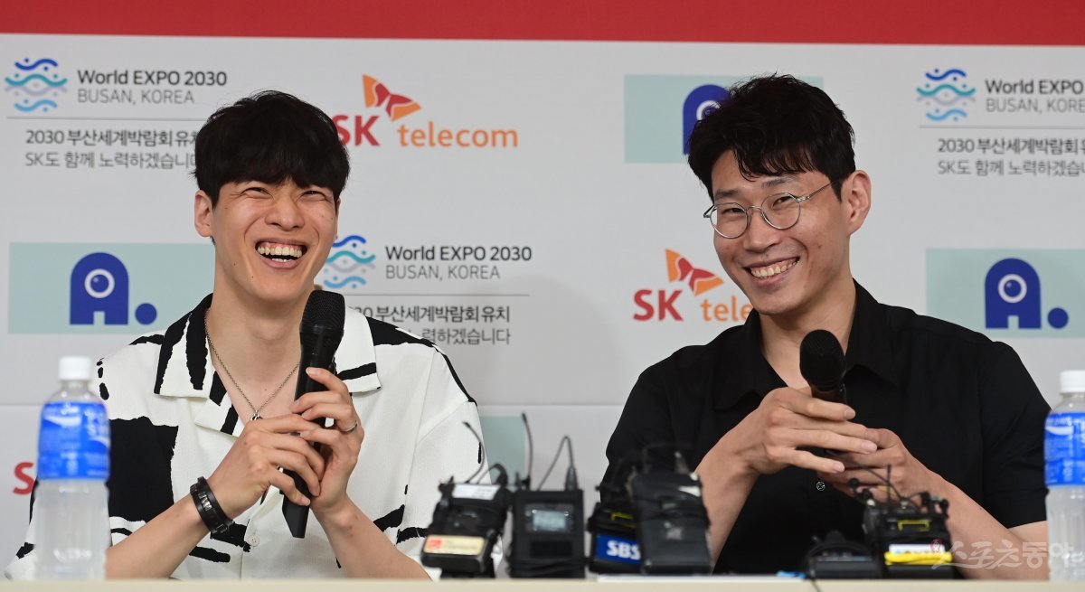 서울 SK 김선형과 오세근이 8일 서울 강남구 논현동 KBL 센터에서 열린 기자회견에서 취재진의 질문에 답하고 있다. 주현희 기자 teth1147@donga.com