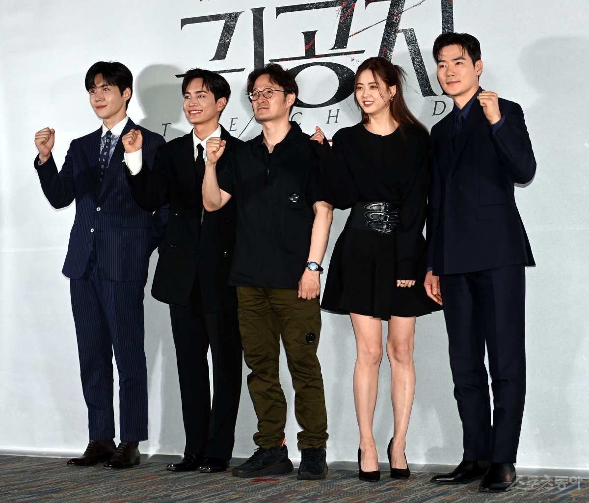 배우 김선호, 강태주, 박훈정 감독, 고아라, 김강우가 8일 서울 강남구 메가박스 코엑스점에서 열린 영화 ‘귀공자’ 시사회에서 포토타임을 갖고 있다.