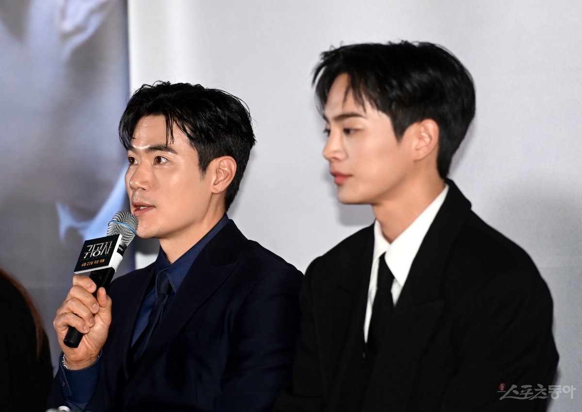 배우 김강우가 8일 서울 강남구 메가박스 코엑스점에서 열린 영화 ‘귀공자’ 시사회에서 취재진의 질문에 대답하고 있다.