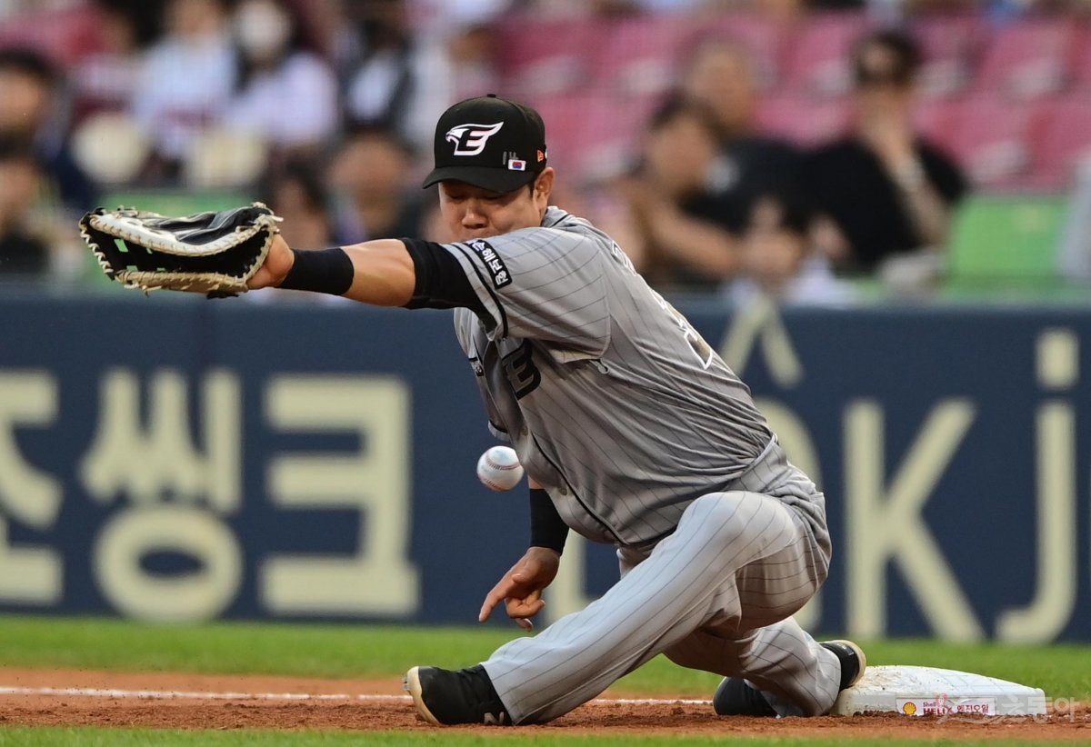 8일 서울 잠실야구장에서 열린 ‘2023 신한은행 SOL KBO리그’ 두산 베어스와 한화 이글스의 경기에서 2회말 무사 두산의 내야 땅볼 때 한화 3루수의 송구 실책으로 1루수 김인환이 볼을 놓치고 있다.