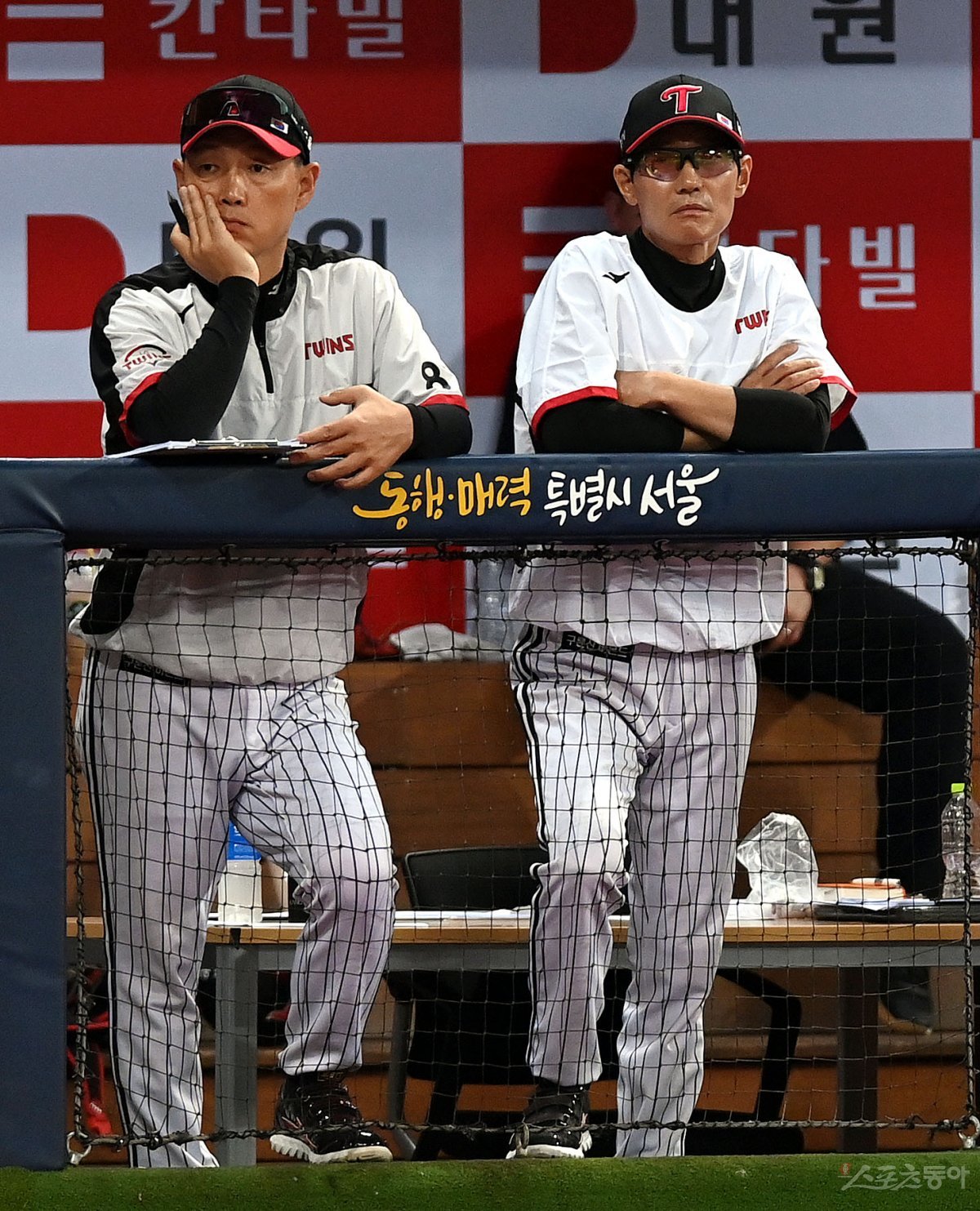 8일 서울 고척스카이돔에서 ‘2023 신한은행 SOL KBO리그’ 키움 히어로즈와 LG 트윈스의 경기가 열렸다. 4회말 LG 염경엽 감독과 김정준 코치가 경기를 지켜보고 있다.