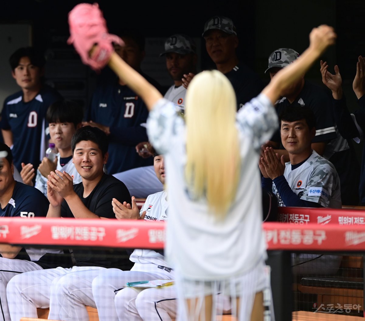 8일 서울 잠실야구장에서 열린 ‘2023 신한은행 SOL KBO리그’ 두산 베어스와 한화 이글스의 경기에 앞서 가수 바다의 파이팅에 두산 더그아웃의 선수들이 손뼉을 치고 있다.