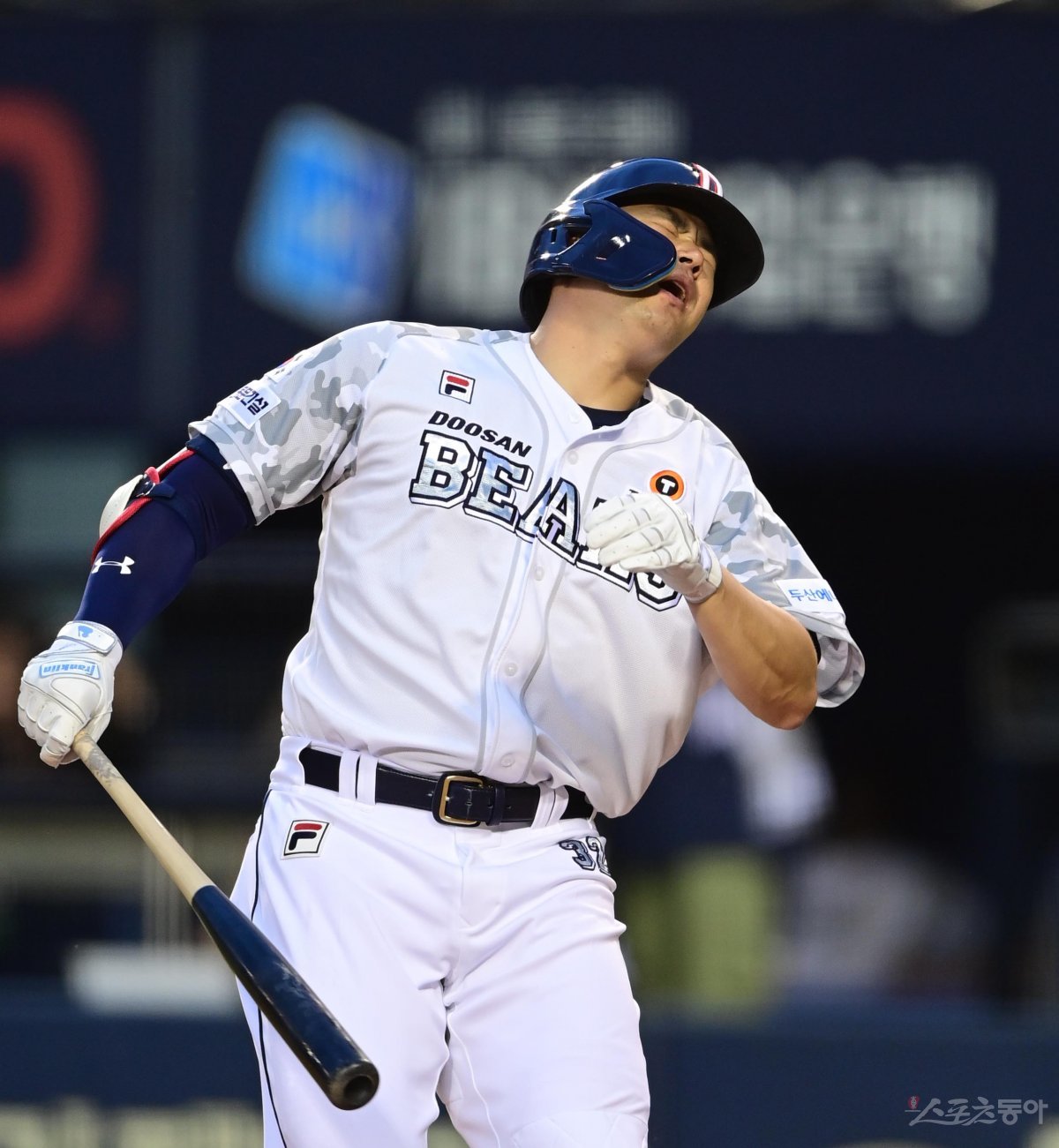 8일 서울 잠실야구장에서 열린 ‘2023 신한은행 SOL KBO리그’ 두산 베어스와 한화 이글스의 경기에서 3회말 2사 1루 두산 김재환이 뜬공을 친 후 아쉬워하고 있다.