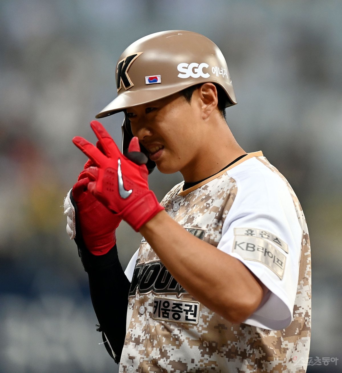 8일 서울 고척스카이돔에서 ‘2023 신한은행 SOL KBO리그’ 키움 히어로즈와 LG 트윈스의 경기가 열렸다. 6회말 1사 만루에서 키움 송성문이 2타점 적시타를 날린 후 세리머니를 펼치고 있다.