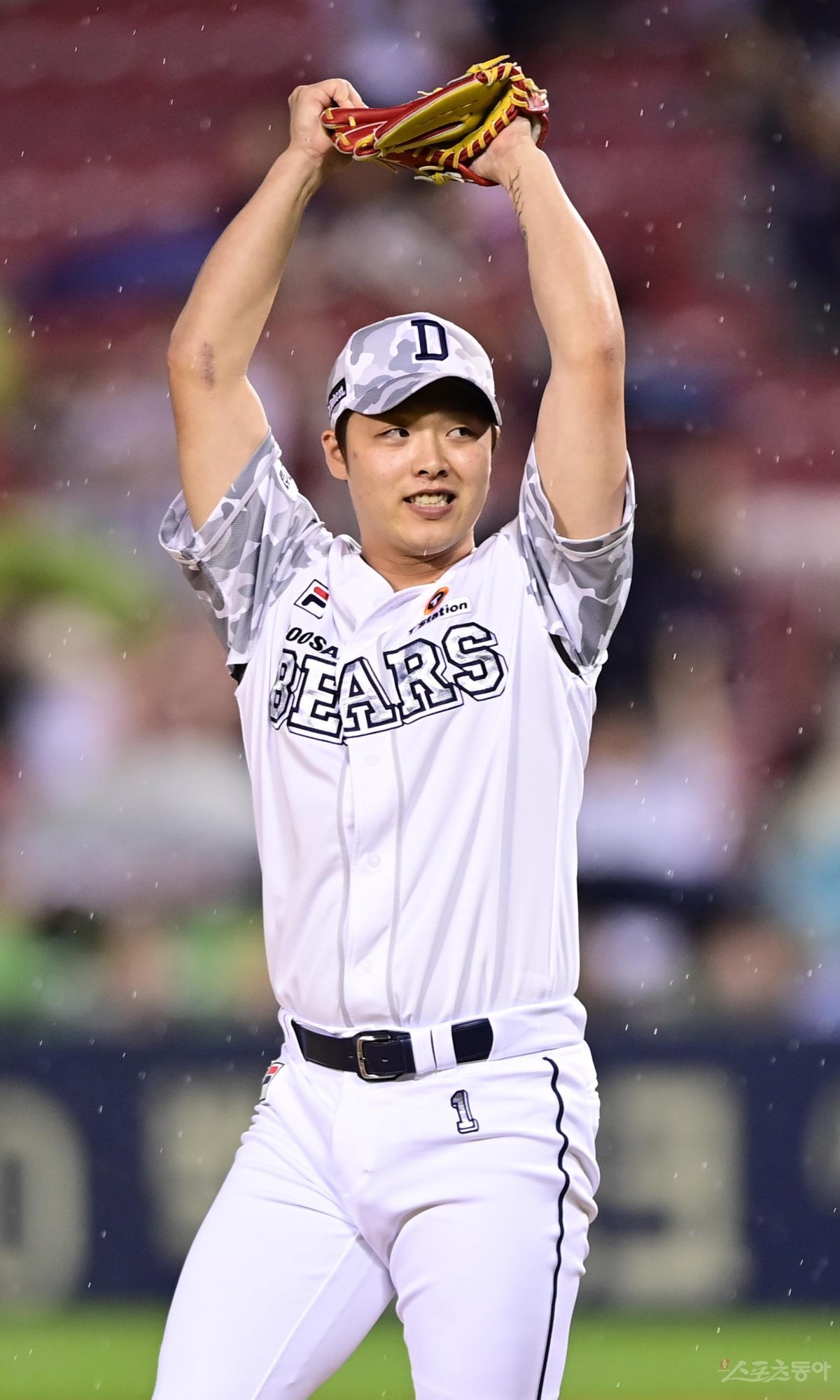 8일 서울 잠실야구장에서 열린 ‘2023 신한은행 SOL KBO리그’ 두산 베어스와 한화 이글스의 경기에서 2-1로 승리한 두산 박치국이 기뻐하고 있다.