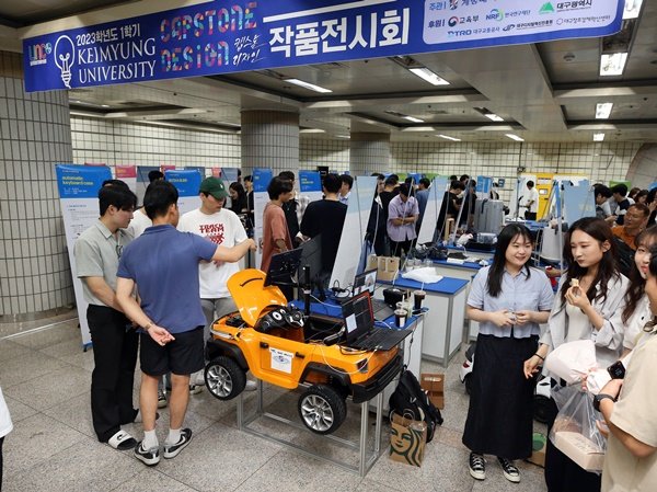 계명대는 지난 8일 대구도시철도 계명대역에서 대구교통공사 김기혁 사장, 계명대 교수, 직원, 학생, 일반 시민 등 1,000여 명이 참석한 가운데 ‘LINC 3.0 2023학년도 1학기 캡스톤디자인 작품전시회’를 열고, 작품전시 및 경진대회를 개최했다.캡스톤디자인은 전공과정에서 배운 내용을 바탕으로 작품을 기획·설계·제작하는 종합설계 교육프로그램이다. 학생들은 팀을 구성해 기업과 연계한 캡스톤디자인 프로젝트를 한 학기동안 수행하고, 창의 설계를 도입한 시제품 전시 및 전공역량을 겸비한 연구 결과를 발표·전시했다.