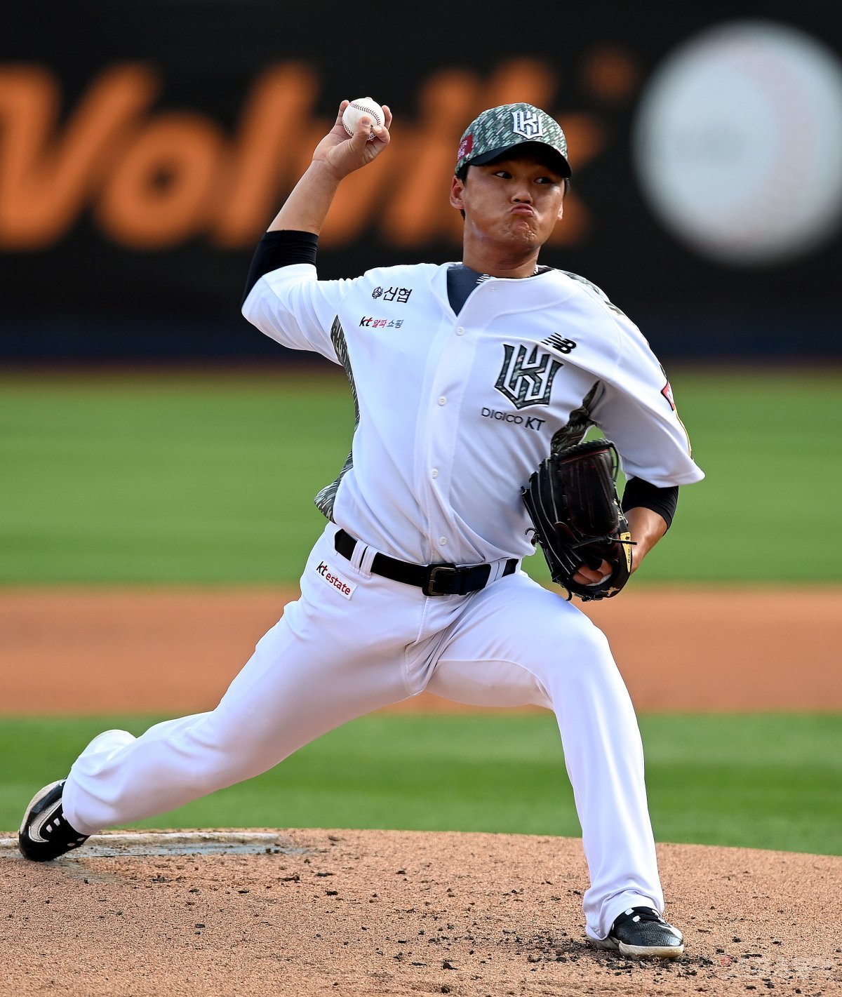 11일 경기도 수원 kt위즈파크에서 ‘2023 신한은행 SOL KBO리그’ kt 위즈와 키움 히어로즈의 경기가 열렸다. kt 선불투수 주권이 힘차게 볼을 던지고 있다.