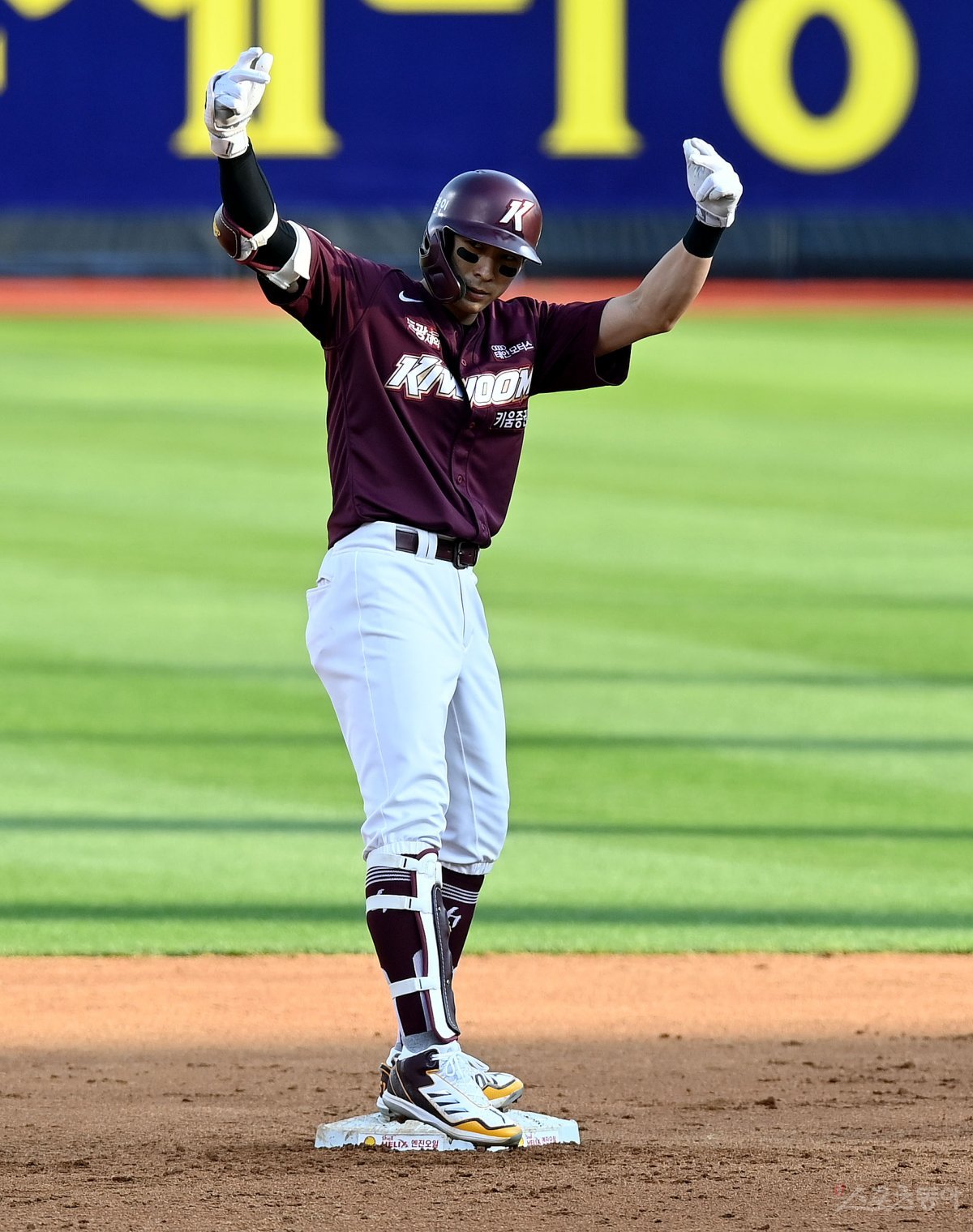 11일 경기도 수원 kt위즈파크에서 ‘2023 신한은행 SOL KBO리그’ kt 위즈와 키움 히어로즈의 경기가 열렸다. 4회초 1사 1루에서 키움 이정후가 2루타를 날린 후 세리머니를 펼치고 있다.