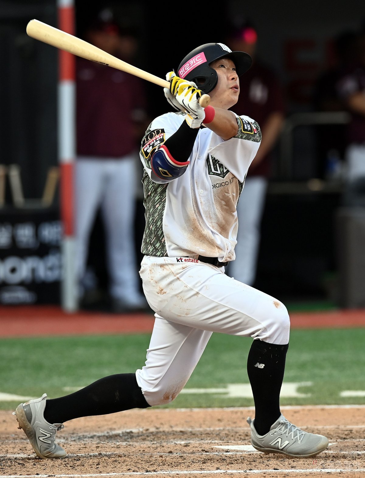 11일 경기도 수원 kt위즈파크에서 ‘2023 신한은행 SOL KBO리그’ kt 위즈와 키움 히어로즈의 경기가 열렸다. 6회말 무사 만루에서 kt 이호연이 희생플라이를 날리고 있다.