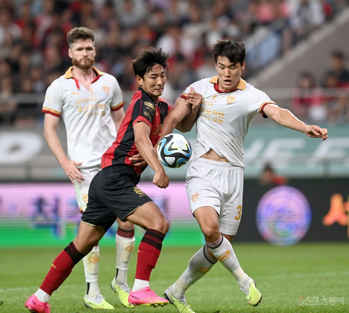 11일 서울월드컵경기장에서 열린 프로축구 ‘하나원큐 K리그1 2023’ 서울과 포항 경기에서 서울 권완규와 포이 이호재가 볼다툼을 하고 있다.