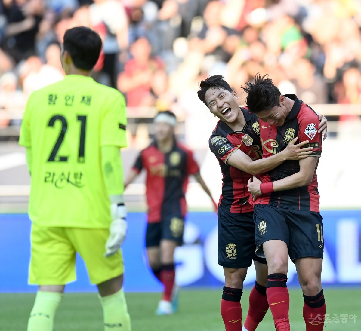 11일 서울월드컵경기장에서 열린 프로축구 ‘하나원큐 K리그1 2023’ 서울과 포항 경기에서 서울 황의조가 선제골을 성공시킨 후 나상호와 기뻐하고 있다.