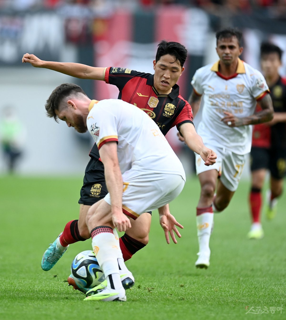 11일 서울월드컵경기장에서 열린 프로축구 ‘하나원큐 K리그1 2023’ 서울과 포항 경기에서 서울 나상호가 포항의 수비를 뚫고 공격을 하고 있다.