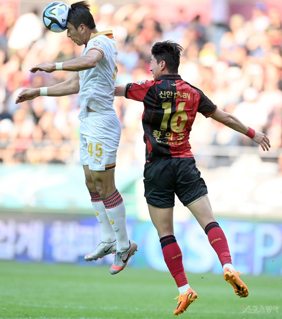 11일 서울월드컵경기장에서 열린 프로축구 ‘하나원큐 K리그1 2023’ 서울과 포항 경기에서 포항 하창래가 서울 황의조에 앞서 헤딩을 하고 있다.