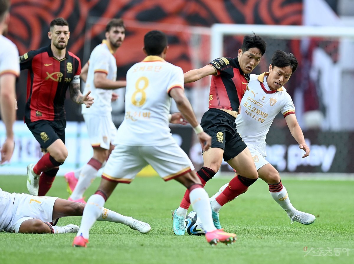 11일 서울월드컵경기장에서 열린 프로축구 ‘하나원큐 K리그1 2023’ 서울과 포항 경기에서 서울 나상호가 포항의 수비를 뚫고 공격을 하고 있다.
