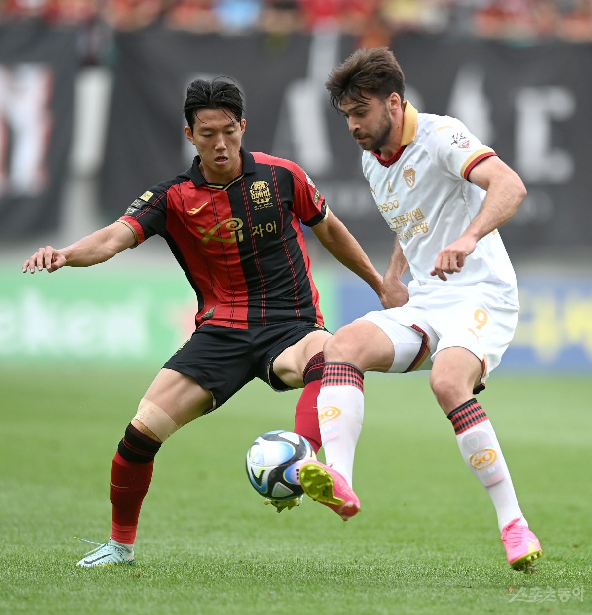 11일 서울월드컵경기장에서 열린 프로축구 ‘하나원큐 K리그1 2023’ 서울과 포항 경기에서 서울 이한범과 포항 제카가 볼다툼을 하고 있다.