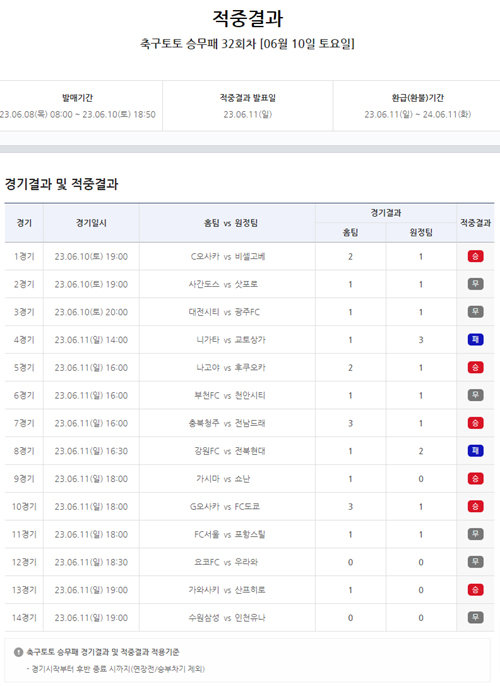 K리그1, 2 및 J리그 14경기 대상 축구토토 승무패 32회차 적중 결과
