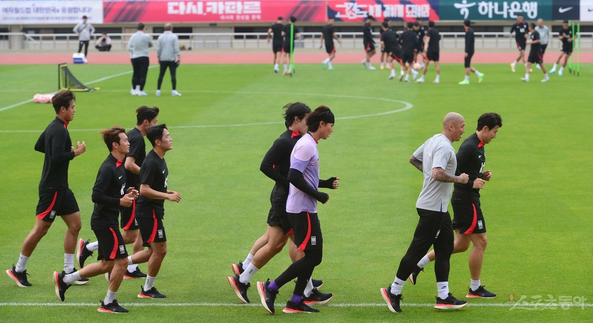 축구국가대표팀이 12일 부산 구덕운동장에서 페루, 엘살바도르와 친선경기에 앞서 소집 훈련을 진행했다. 선수들이 러닝을 하고 있다.