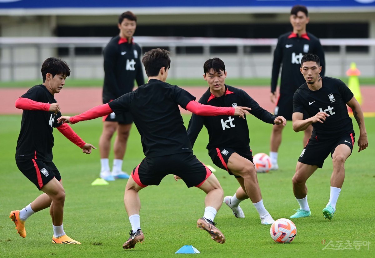 축구국가대표팀이 12일 부산 구덕운동장에서 페루, 엘살바도르와 친선경기에 앞서 소집 훈련을 진행했다. 한국 이강인, 오현규, 박규현이 훈련을 하고 있다.