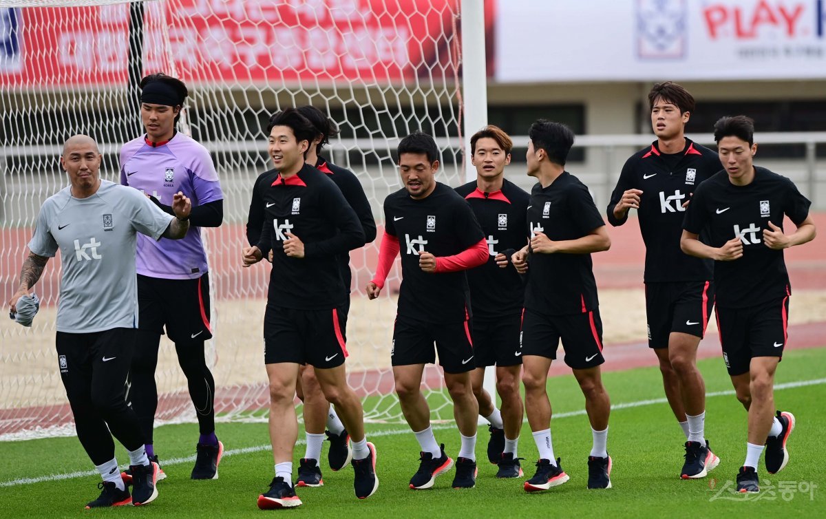 축구국가대표팀이 12일 부산 구덕운동장에서 페루, 엘살바도르와 친선경기에 앞서 소집 훈련을 진행했다. 선수들이 러닝을 하고 있다.