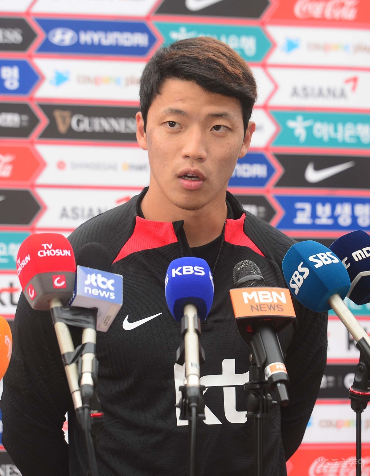 축구국가대표팀이 12일 부산 구덕운동장에서 페루, 엘살바도르와 친선경기에 앞서 소집 훈련을 진행했다. 한국 황희찬이 훈련에 앞서 인터뷰를 하고 있다.