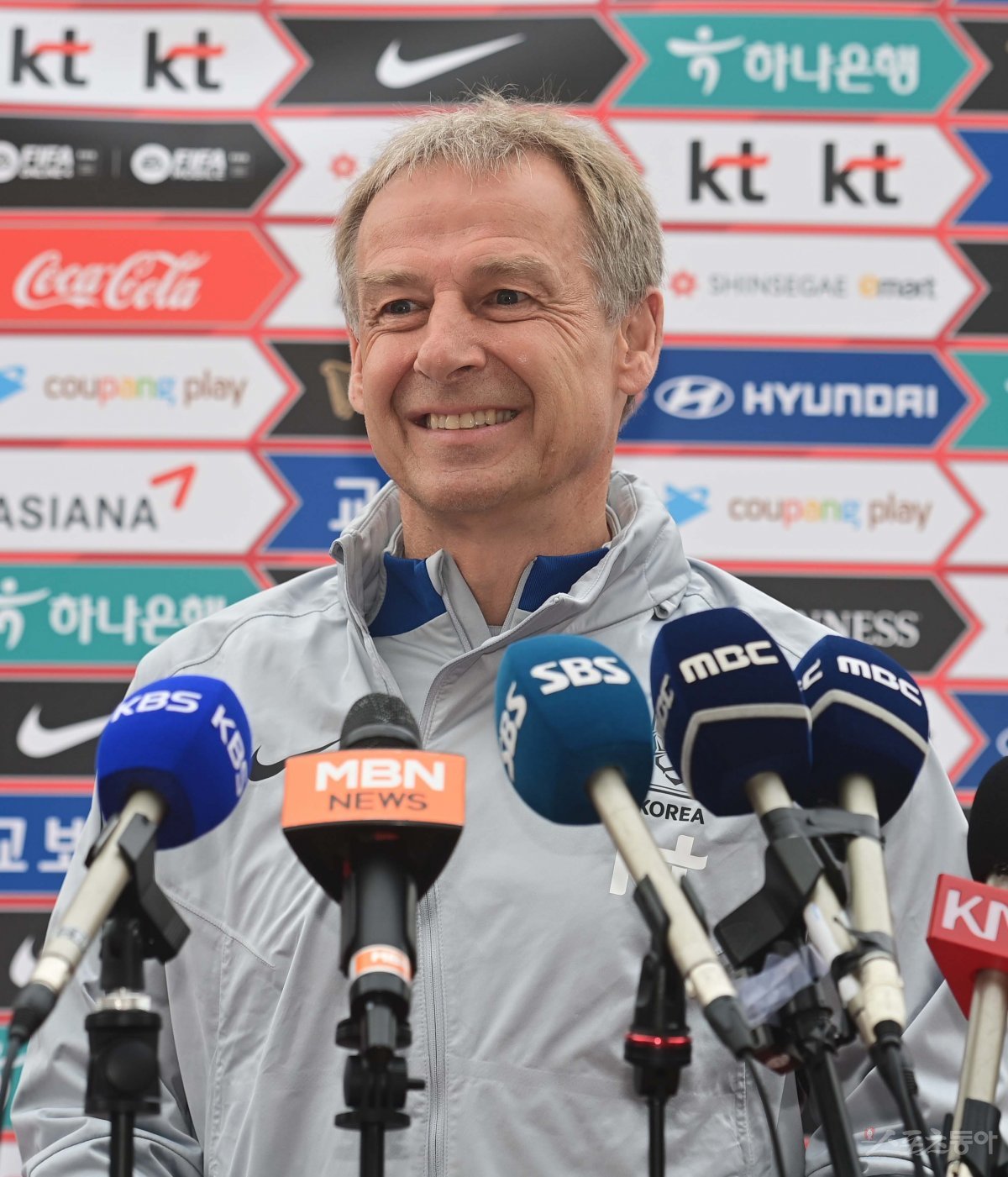 축구국가대표팀이 12일 부산 구덕운동장에서 페루, 엘살바도르와 친선경기에 앞서 소집 훈련을 진행했다. 한국 클린스만 감독이 훈련에 앞서 인터뷰를 하고 있다.