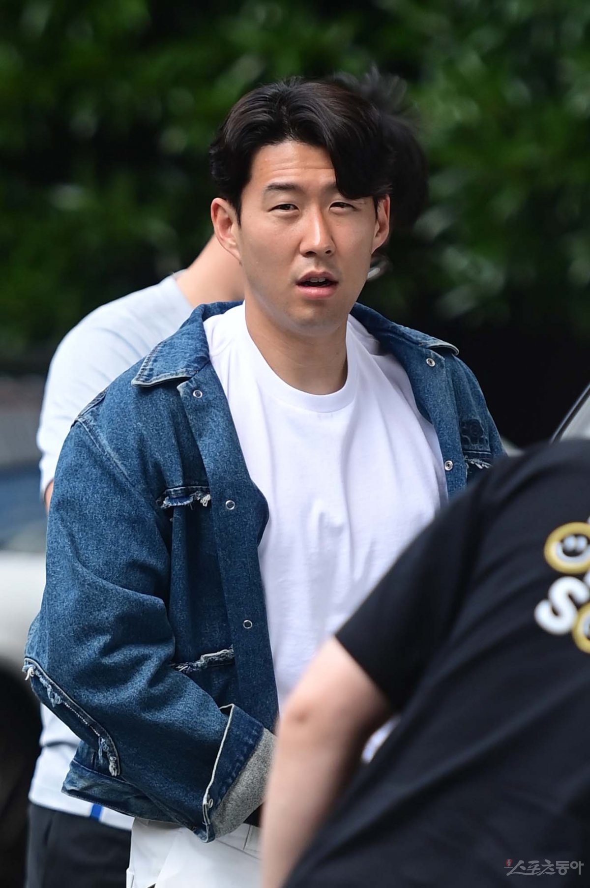 한국 손흥민이 12일 부산 부산진구 부전동 롯데호텔 부산에서 축구국가대표팀의 페루, 엘살바도르와 친선경기에 앞서 소집 훈련을 위해 입소하고 있다.