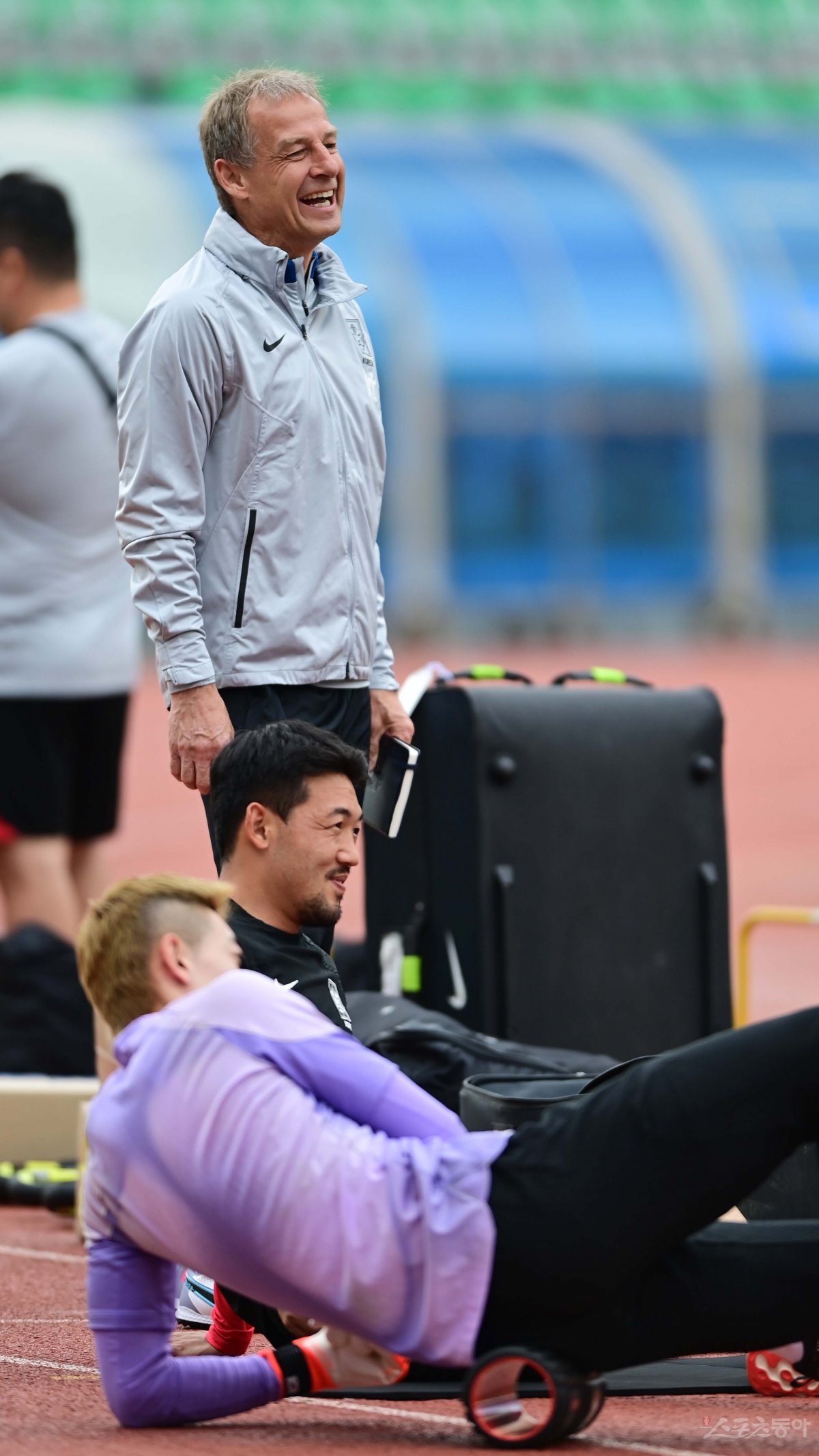 축구국가대표팀이 12일 부산 구덕운동장에서 페루, 엘살바도르와 친선경기에 앞서 소집 훈련을 진행했다. 한국 클린스만 감독이 선수들과 이야기를 하고 있다.