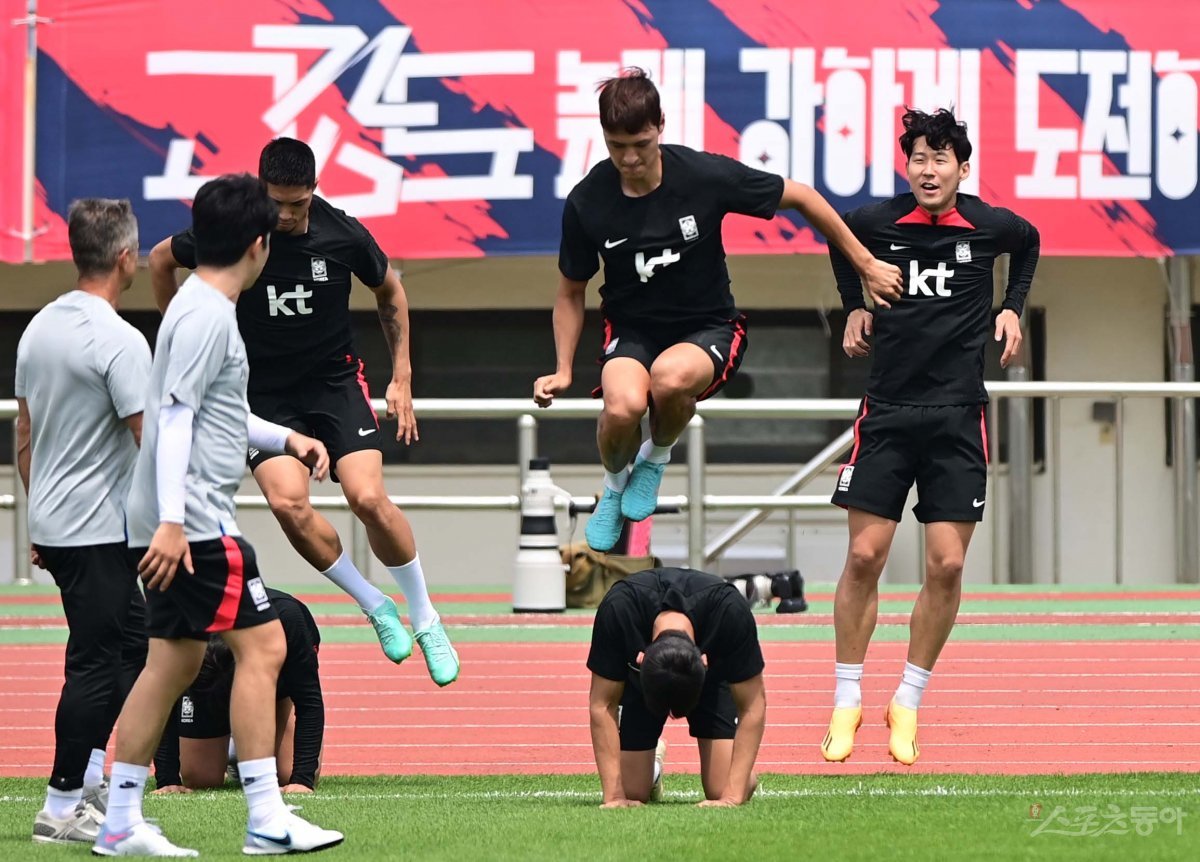 축구국가대표팀이 13일 부산 구덕운동장에서 페루, 엘살바도르와 친선경기에 앞서 소집 훈련을 진행했다. 최근 스포츠 탈장 수술을 받은 것으로 알려진 손흥민이 훈련을 하고 있다.