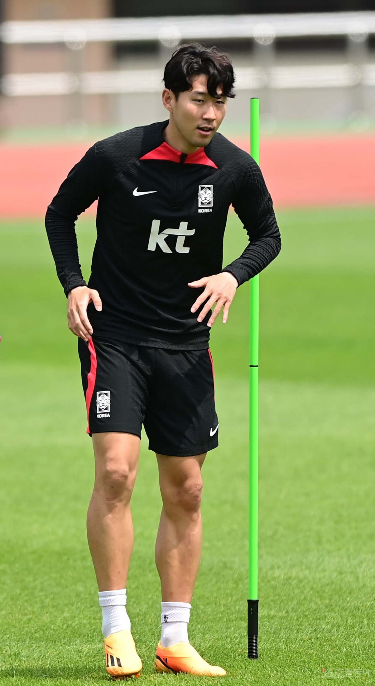 축구국가대표팀이 13일 부산 구덕운동장에서 페루, 엘살바도르와 친선경기에 앞서 소집 훈련을 진행했다. 최근 스포츠 탈장 수술을 받은 것으로 알려진 손흥민이 훈련을 하고 있다.