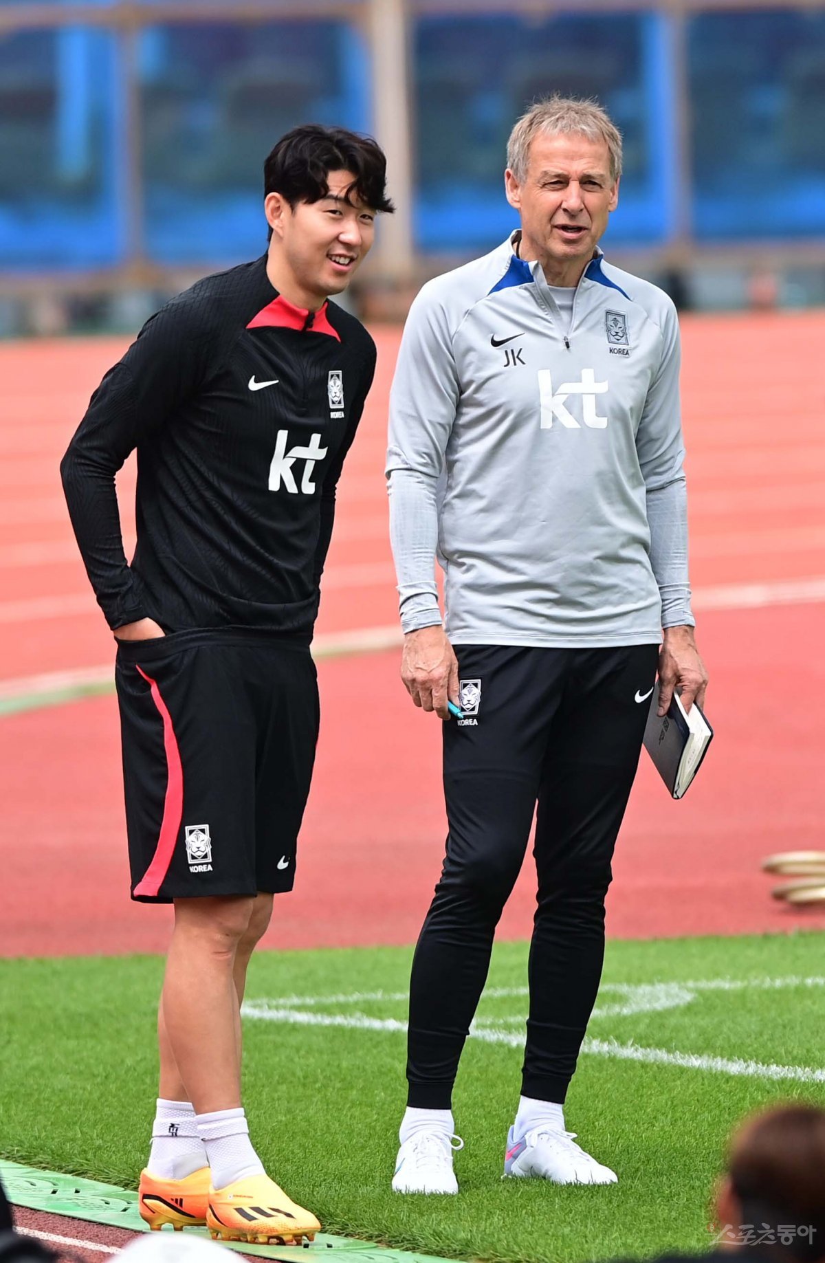 축구국가대표팀이 13일 부산 구덕운동장에서 페루, 엘살바도르와 친선경기에 앞서 소집 훈련을 진행했다. 한국 손흥민과 클린스만 감독이 이야기를 하고 있다.