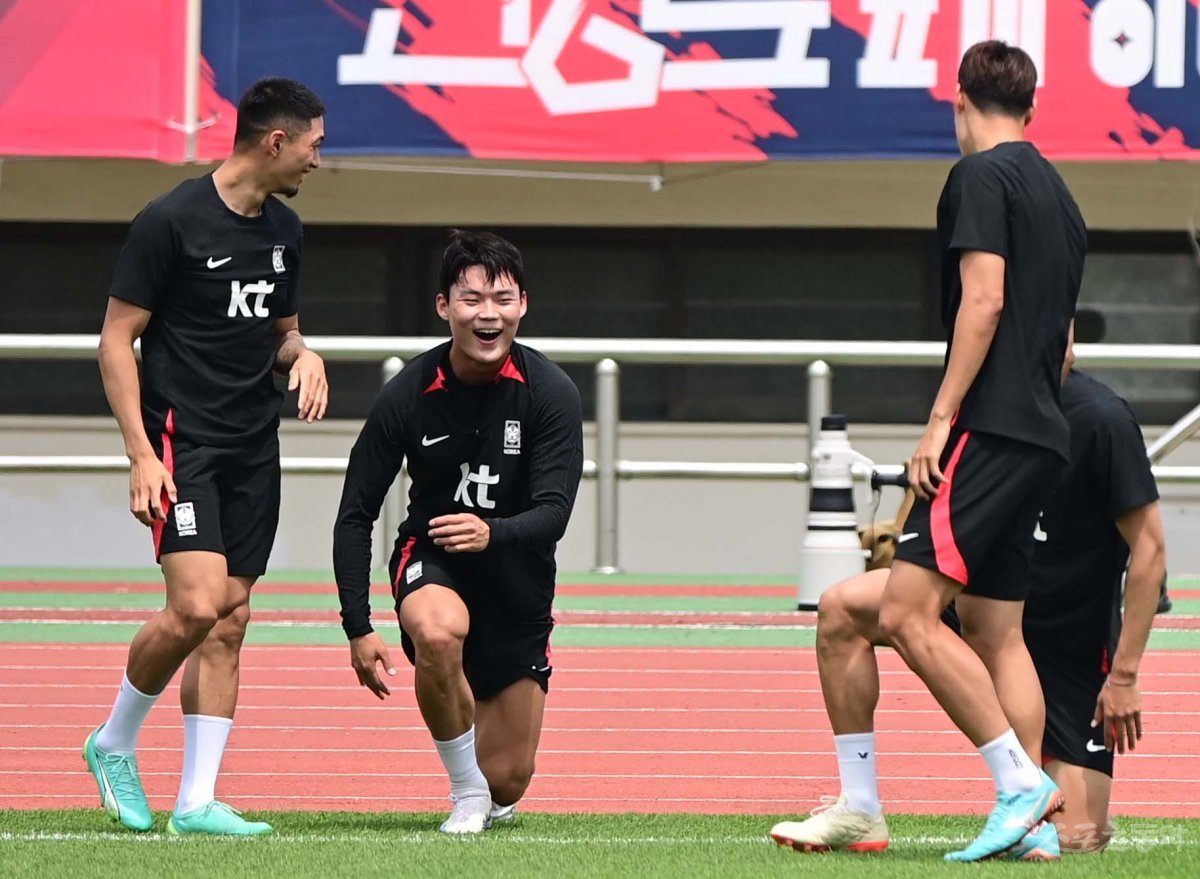 축구국가대표팀이 13일 부산 구덕운동장에서 페루, 엘살바도르와 친선경기에 앞서 소집 훈련을 진행했다. 한국 오현규가 훈련을 하고 있다.