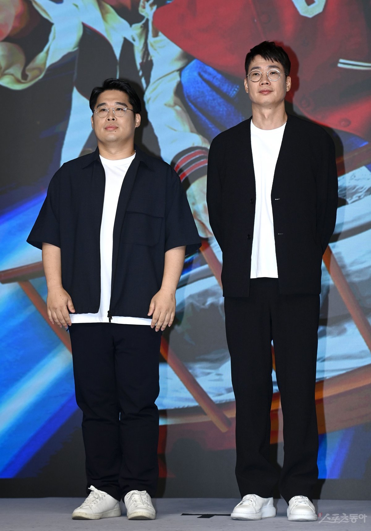 김동진 PD, 조효진 PD가 13일 서울 동대문구 JW메리어트 동대문에서 열린 디즈니+(플러스) 예능 프로그램 ‘더 존 :버텨야 산다 시즌2’ 제작발표회에서 포토타임을 갖고 있다.