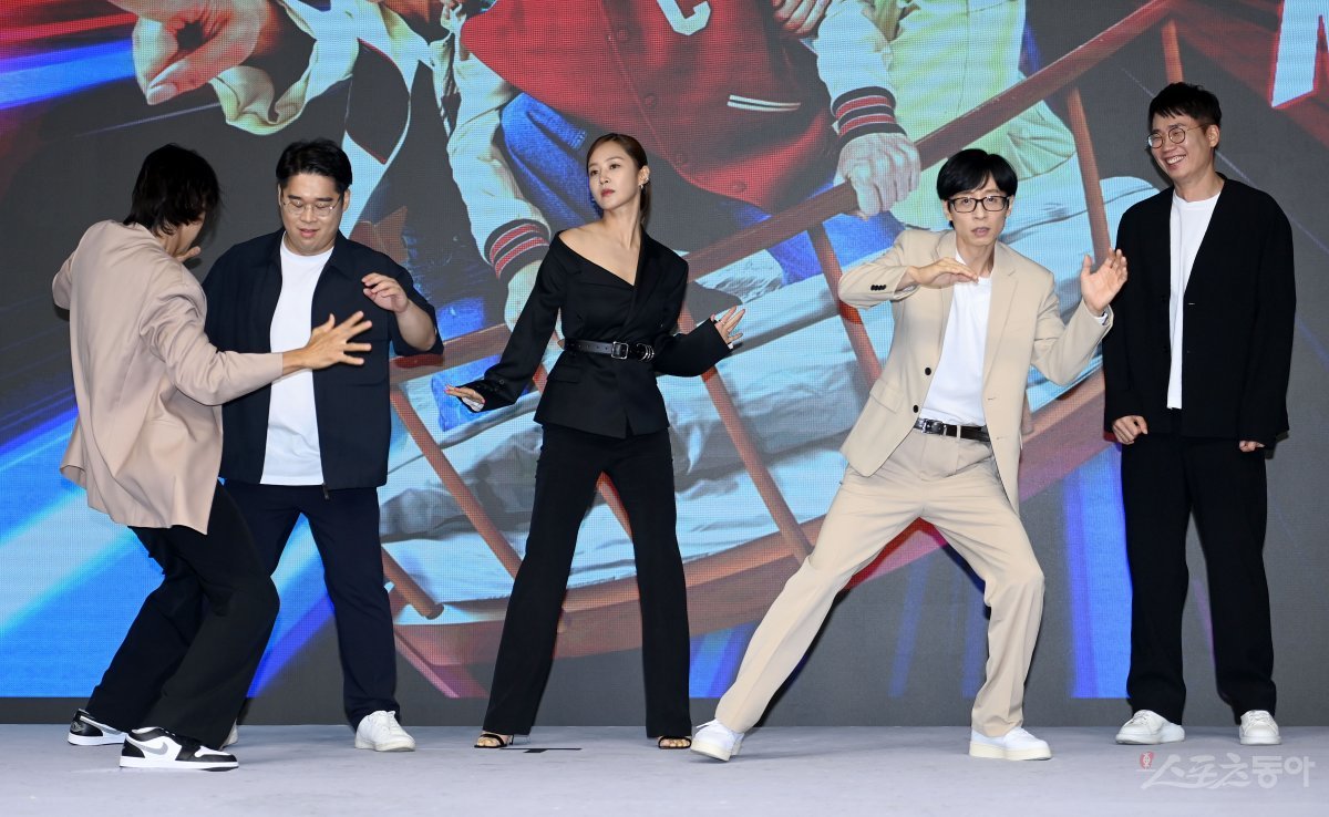 이광수, 김동진 PD, 권유리, 유재석, 조효진 PD가 13일 서울 동대문구 JW메리어트 동대문에서 열린 디즈니+(플러스) 예능 프로그램 ‘더 존 :버텨야 산다 시즌2’ 제작발표회에서 포토타임을 갖고 있다.