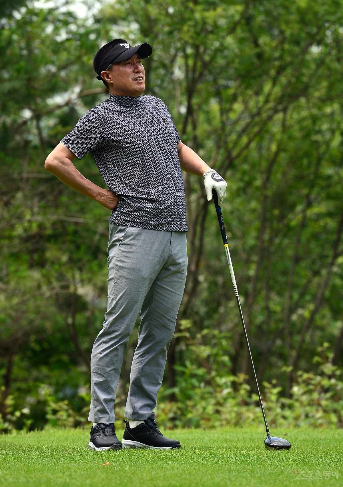 대한축구협회, 한국프로축구연맹, 울산 현대, 전북 현대가 주최하고 스포츠동아, 스포츠서울, 스포츠조선, 스포츠경향, 스포츠월드, 일간스포츠 스포츠전문 미디어 6개 사가 후원하는 ‘2023년 축구인 골프대회’가 13일 강원도 원주 오크힐스CC에서 열렸다. 하석주 전 축구감독이 티샷을 날린 후 바라보고 있다.