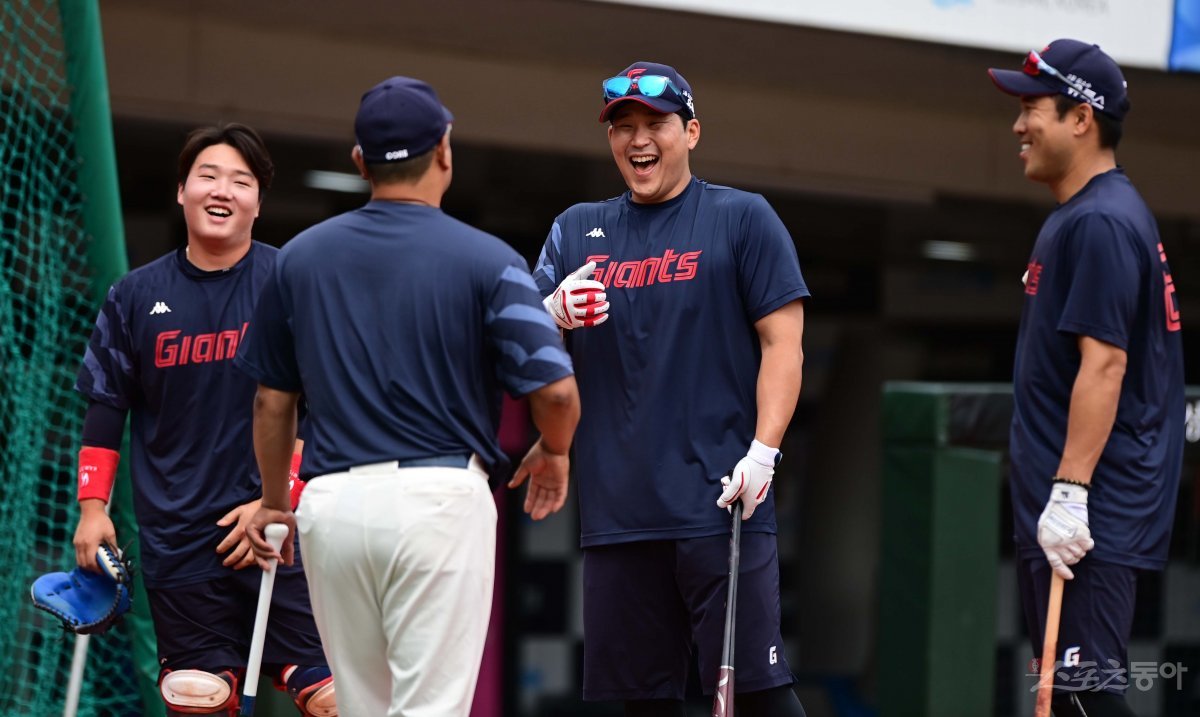 13일 부산 사직야구장에서 열린 ‘2023 신한은행 SOL KBO리그’ 롯데 자이언츠와 한화 이글스의 경기에 앞서 롯데 정보근, 유강남, 전준우가 코치와 이야기하며 웃고 있다.