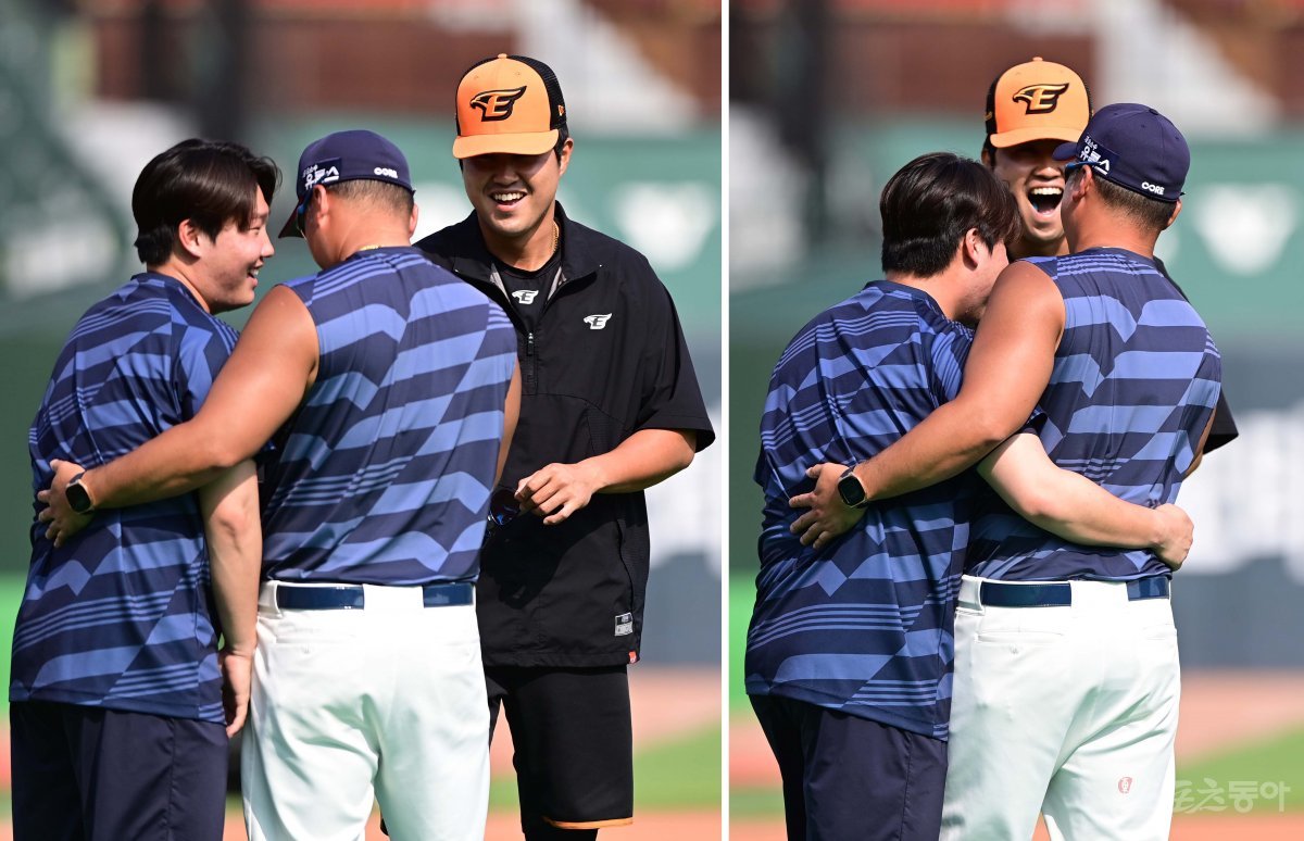 13일 부산 사직야구장에서 열린 ‘2023 신한은행 SOL KBO리그’ 롯데 자이언츠와 한화 이글스의 경기에 앞서 한화 채은성이 롯데 정보근과 이병규 코치의 장난에 웃고 있다.