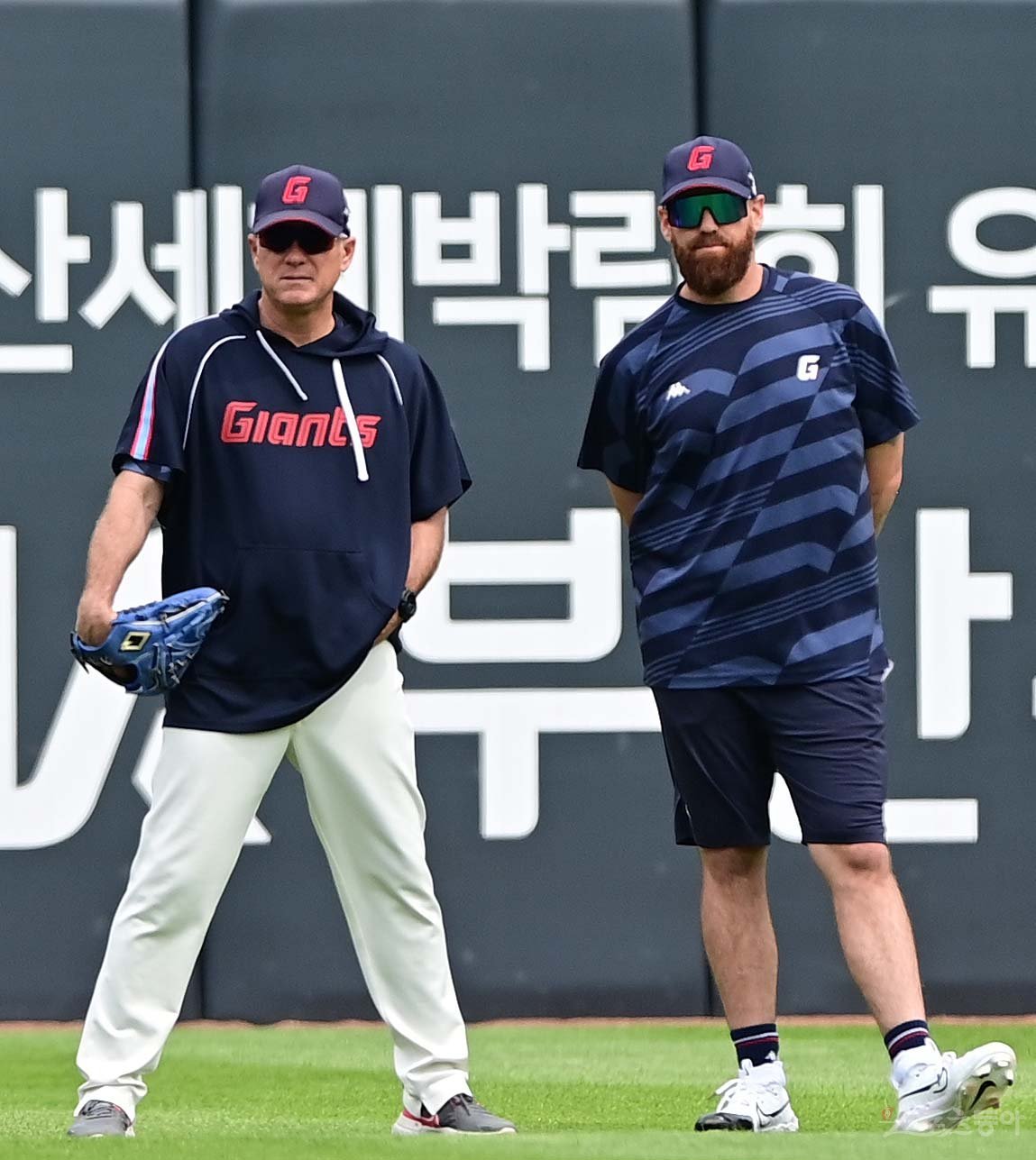 13일 부산 사직야구장에서 열린 ‘2023 신한은행 SOL KBO리그’ 롯데 자이언츠와 한화 이글스의 경기에 앞서 롯데 서튼 감독과 스트레일리가 외야에서 선수들의 훈련을 지켜보고 있다.