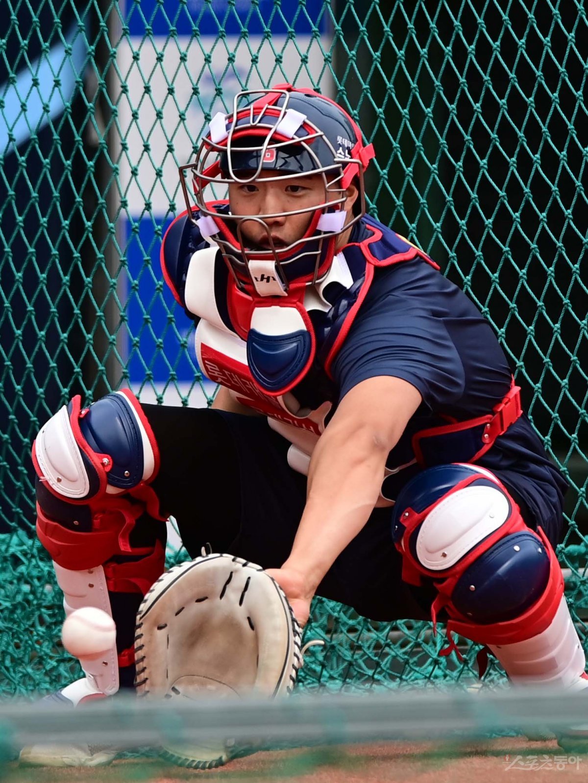 13일 부산 사직야구장에서 열린 ‘2023 신한은행 SOL KBO리그’ 롯데 자이언츠와 한화 이글스의 경기에 앞서 롯데 손성빈이 포수 훈련을 하고 있다.