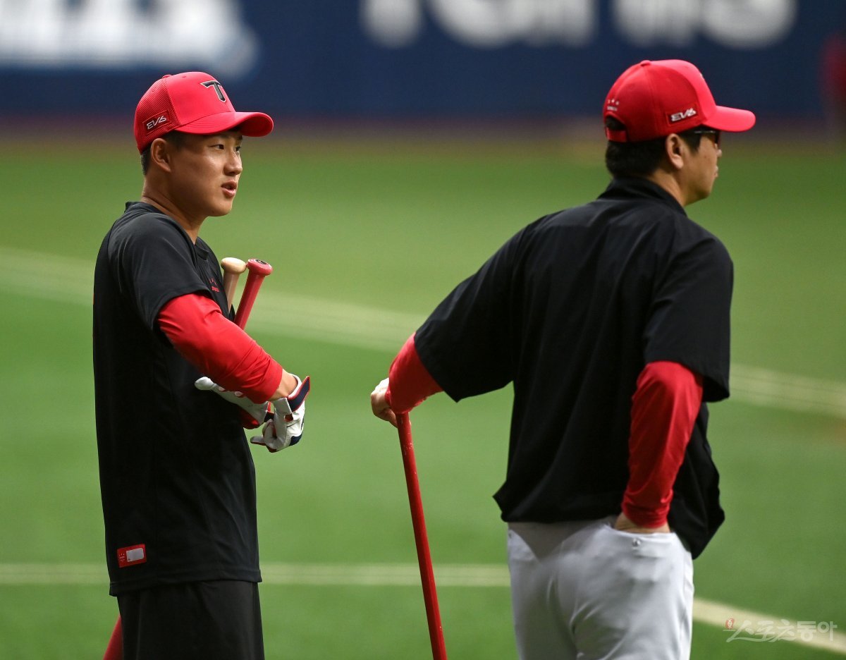 13일 서울 고척스카이돔에서 ‘2023 신한은행 SOL KBO리그’ KIA 타이거즈와 키움 히어로즈 경기가 열렸다. 군 전역 후 1군에 등록한 KIA 최원준이 김종국 감독과 이야기하고 있다.