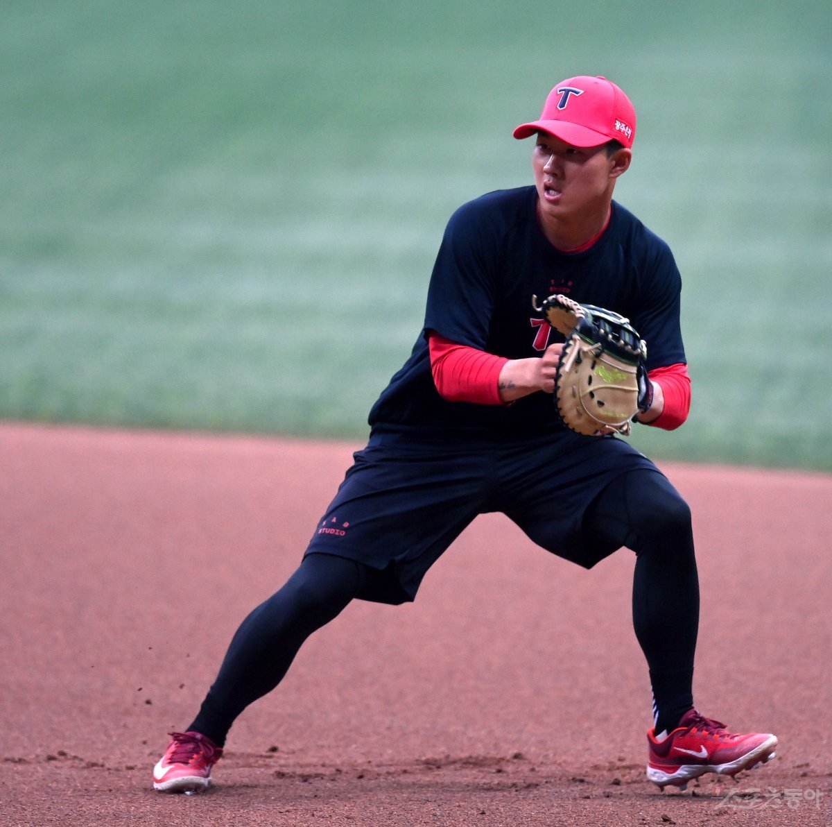 13일 서울 고척스카이돔에서 ‘2023 신한은행 SOL KBO리그’ KIA 타이거즈와 키움 히어로즈 경기가 열렸다. 군 전역 후 1군에 등록한 KIA 최원준이 1루 수비 훈련을 하고 있다.