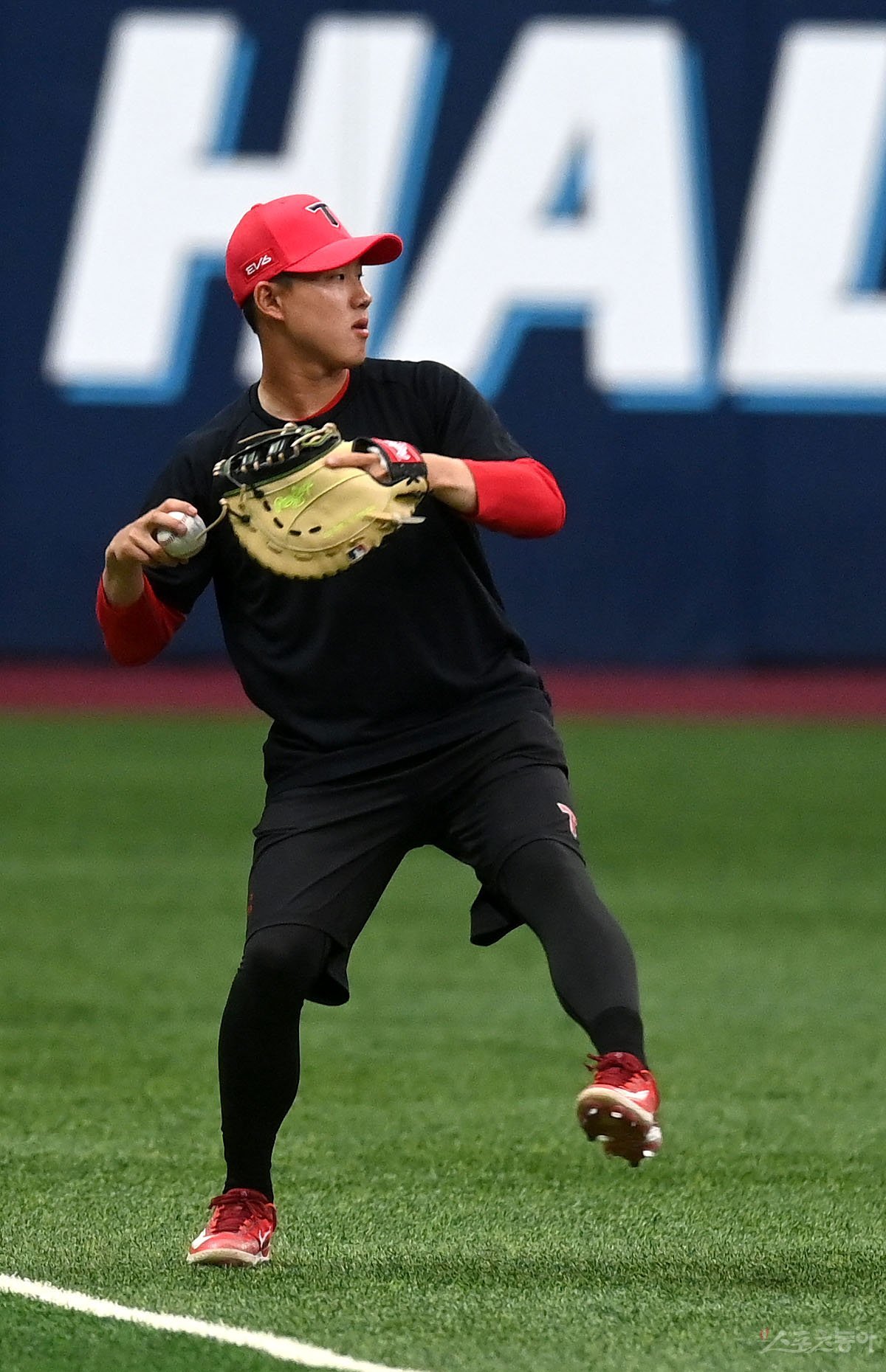 13일 서울 고척스카이돔에서 ‘2023 신한은행 SOL KBO리그’ KIA 타이거즈와 키움 히어로즈 경기가 열렸다. 군 전역 후 1군에 등록한 KIA 최원준이 수비 훈련을 하고 있다.