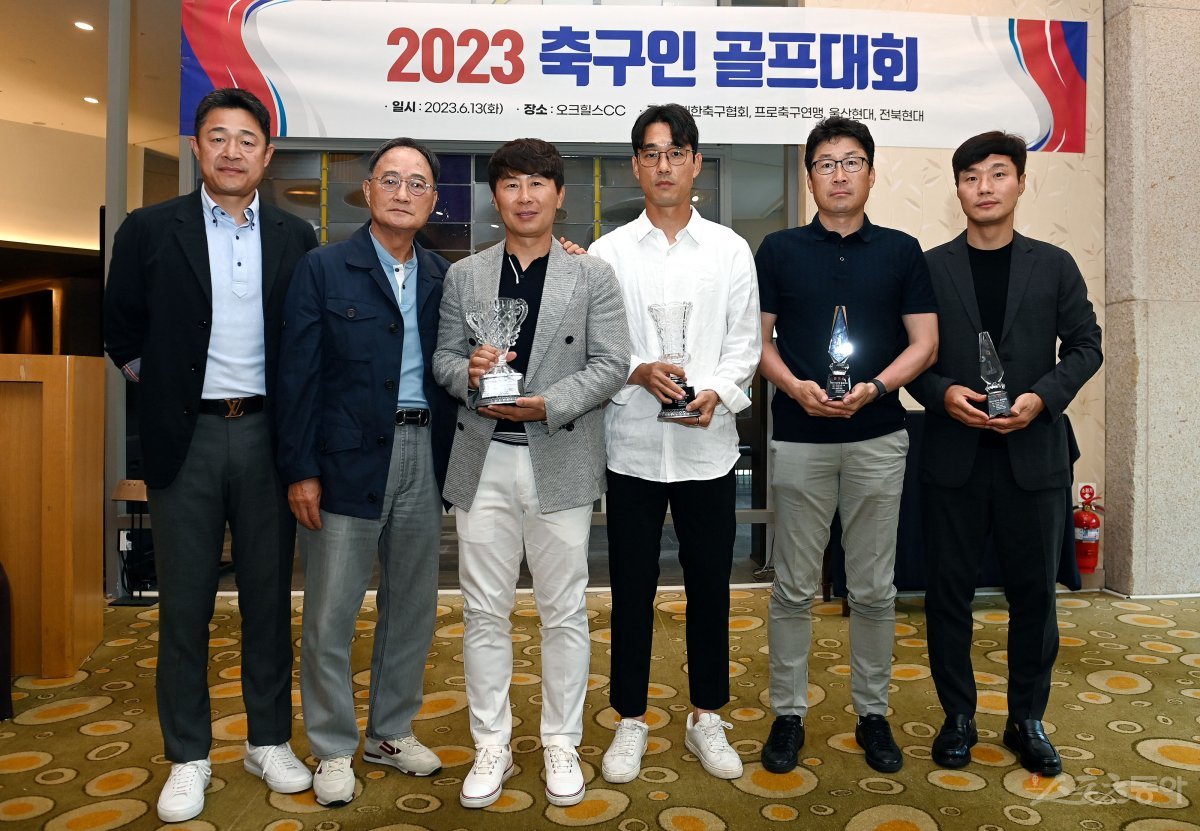 대한축구협회, 한국프로축구연맹, 울산 현대, 전북 현대가 주최하고 스포츠동아, 스포츠서울, 스포츠조선, 스포츠경향, 스포츠월드, 일간스포츠 스포츠전문 미디어 6개 사가 후원하는 ‘2023년 축구인 골프대회’가 13일 강원도 원주 오크힐스CC에서 열렸다. 이민성(롱기스트), 김호곤(니어리스트), 김기동(메달리스트), 박주영(우승), 이기형(준우승), 남기일(3위)이 기념촬영을 하고 있다.